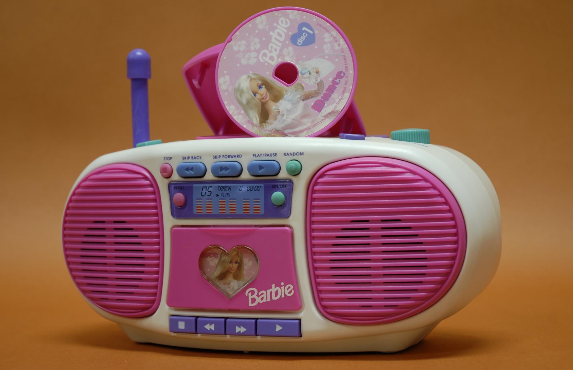Nur Pseudo-Abspielgerät, Plastik-CDs und -kassette dienen nur als Auslöser für vorher eingespeichertes Programm. Ursprünglich je 4 CDs und Kassetten (Rock, Country, Dance, Hip-Hop/Rap), hier nur noch 3 CDs und 2 Kassetten. In weiß und Barbie-pink gehalten. Je eine Knopfleiste für Kassette und CD. Lautstärke regelbar, Tonqualität passabel, Antenne ausziehbar. Mit Tragegriff. Auf Rückseite Aufbewahrungsvertiefungen für CDs und Kassetten.