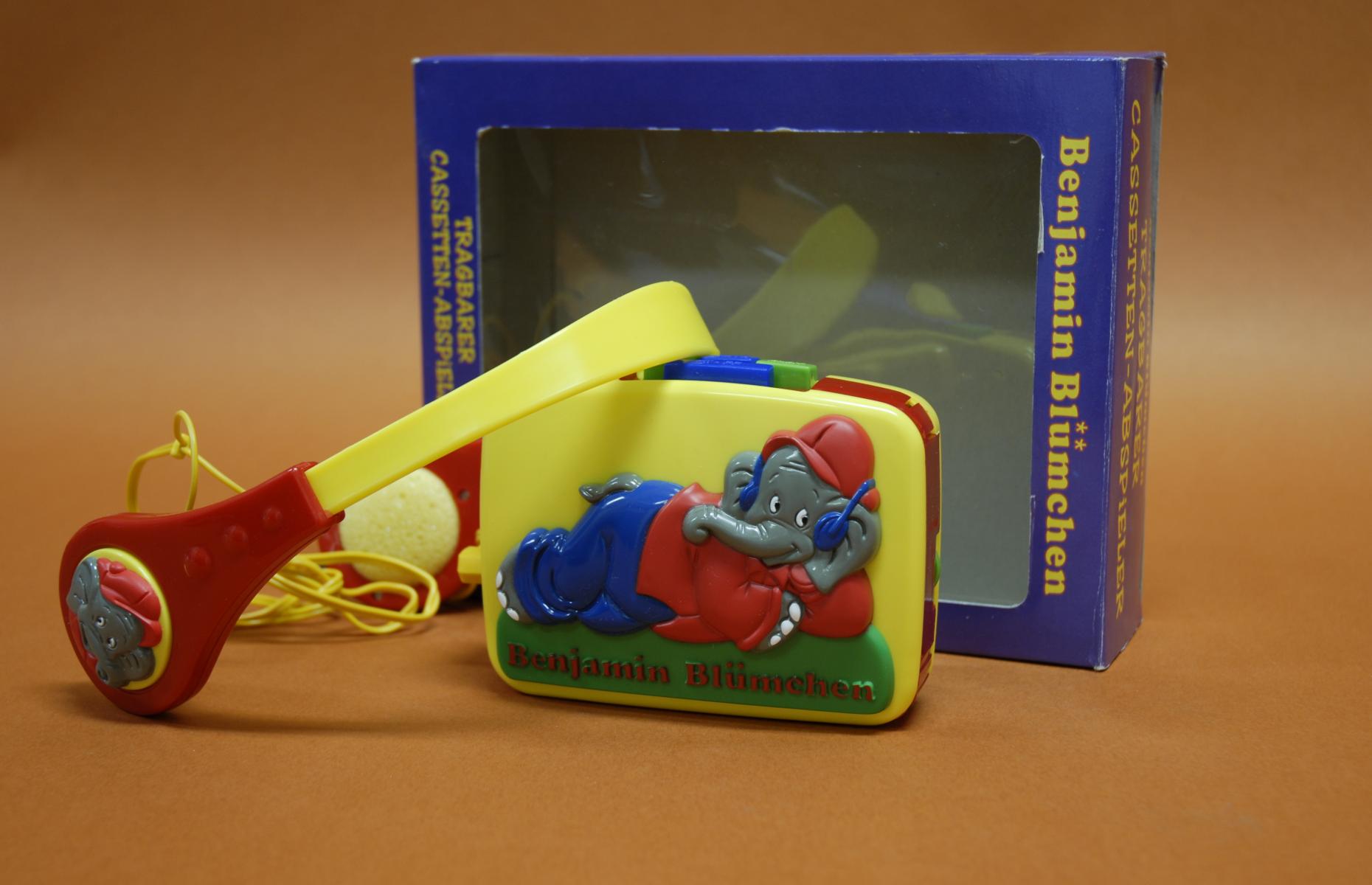 Tragbarer Kassettenspieler (Walkman) im Benjamin Blümchen-Design für Kinder ab fünf Jahren. Enthält Abspielgerät, Kopfhörer, Gürtelclip, Umhängeband. Der Kassettenspieler ist batteriebetrieben.