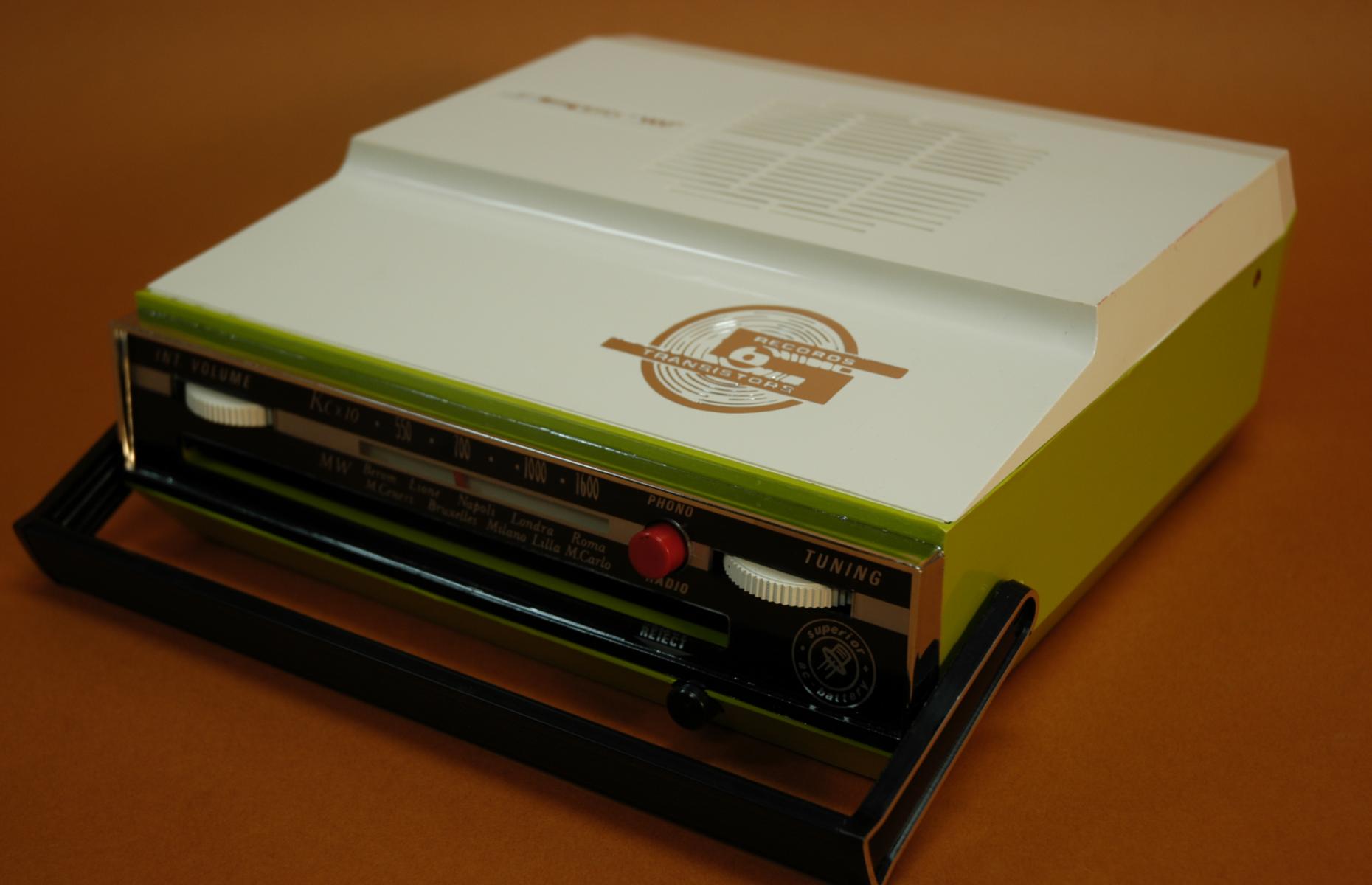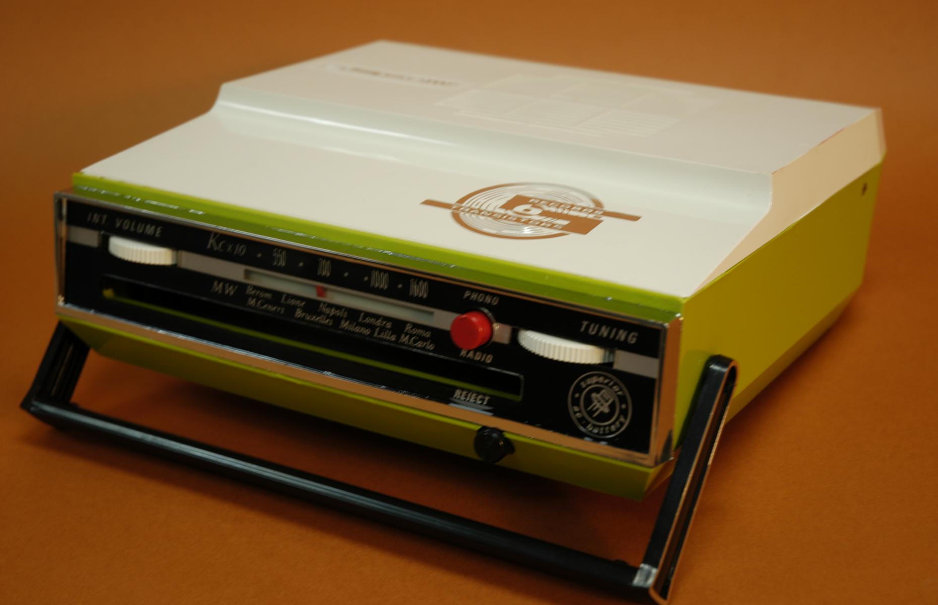 Tragbarer Plattenschlucker, Slot-in-Plattenspieler mit Radio. Hellgrün und weiß, Betrieb wahlweise mit Batterie oder Netzteil. Lautsprecher ins Gerät integriert. Lautstärkeregler, Sendersuchlauf und Reject-Knopf an der Vorderseite.