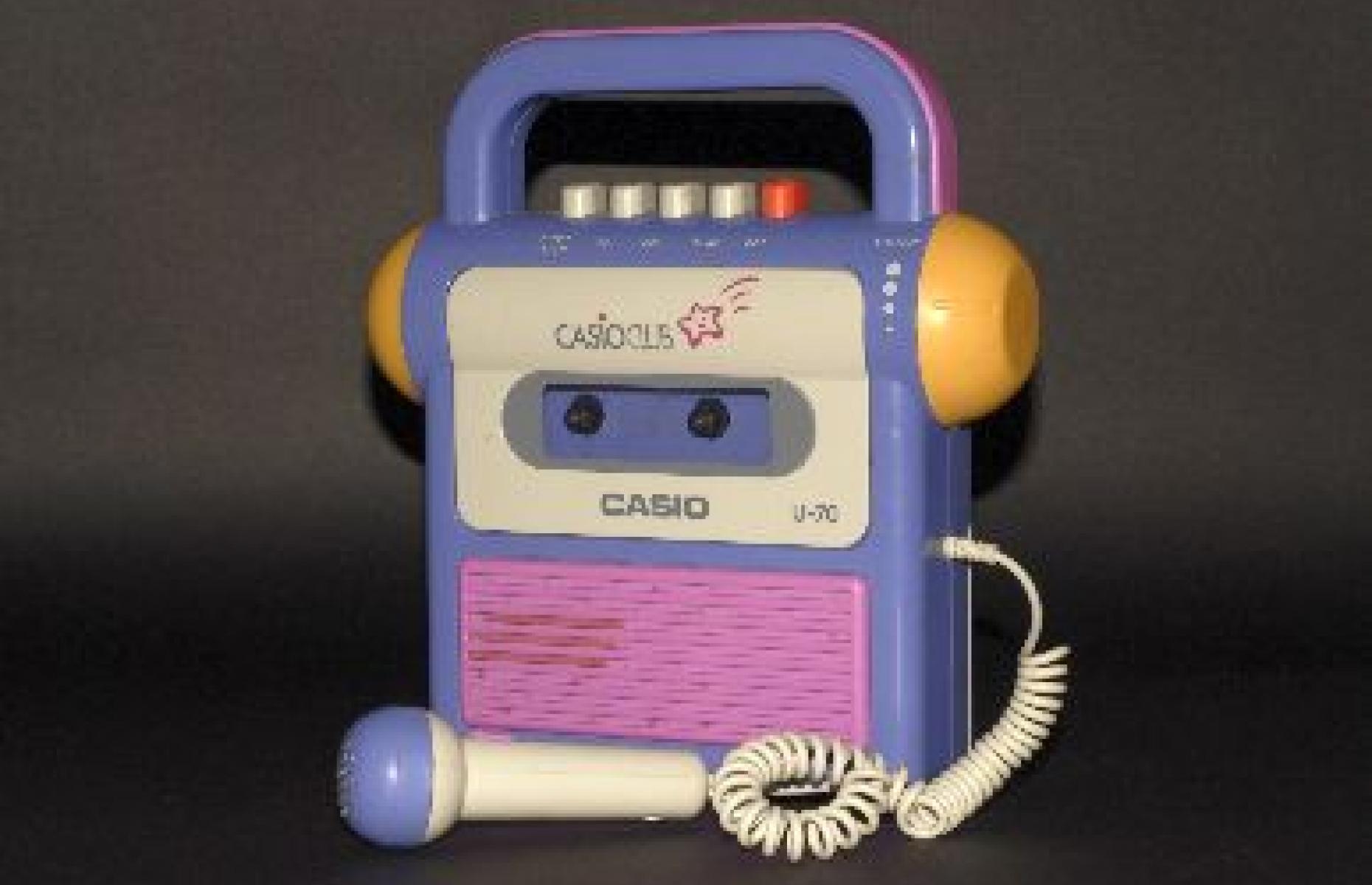 Kinderkassettenrekorder mit Mikrofon und Tragegriff. Der Rekorder ist in den Farben violett, rosa und gelb gehalten. Auf der Rückseite befindet sich ein rundes Fenster mit Blick auf ein Zahnrad mit einem Motiv, das beim Betrieb optische Effekte ergibt.