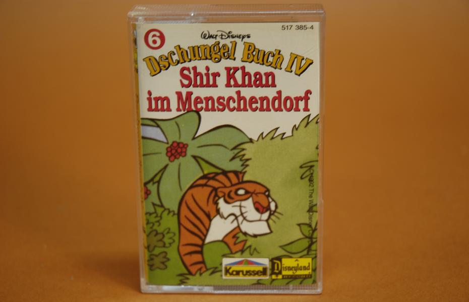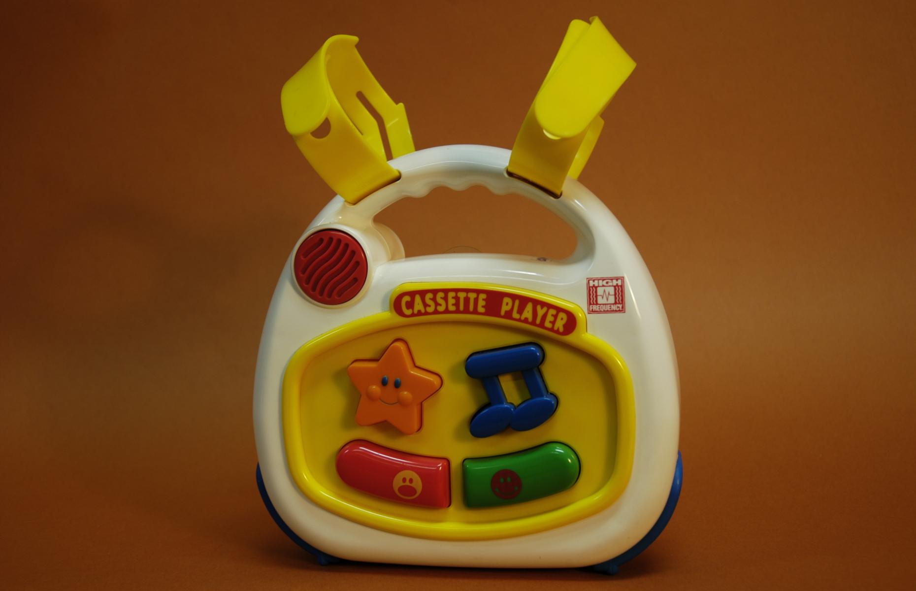 Kinderkassettenrekorder mit gelben Plastikriemen zum Anbringen an Kinderbett. Korpus weiß mit gelbem Kassettendeck. Batteriebetrieben. Alle Bedienteile sind kindergesichert und dem Zugriff des Kindes entzogen. Auf der dem Kind zugewandten Seite sind vier große Tasten (laut/leise, Stern, Noten) angebracht.