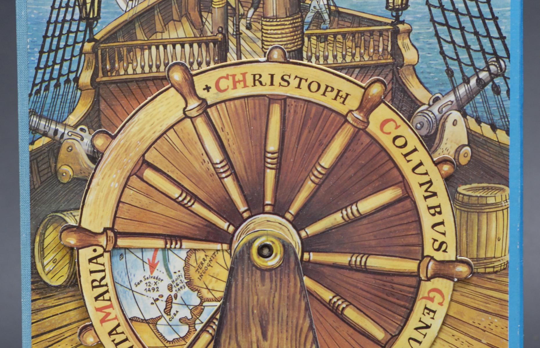Aufgeklappt zeigt sich die Flotte des Christoph Columbus, mit der er den Seeweg nach Indien erkunden wollte. Im Vordergrund prominent die "Santa Maria", im Hintergrund die beiden anderen Schiffe "Nina" und "Pinta". Im Titelblatt lässt sich durch Drehen der Windrose der Weg der Expedition nachvollziehen. Hintergründe erfährt man im 12-seitigen Begleitheft von Helena und Edvard Skodovi. Illustrator und Gestalter ist der bekannte tschechische Grafiker und Buchkünstler Vojtech Kubasta.