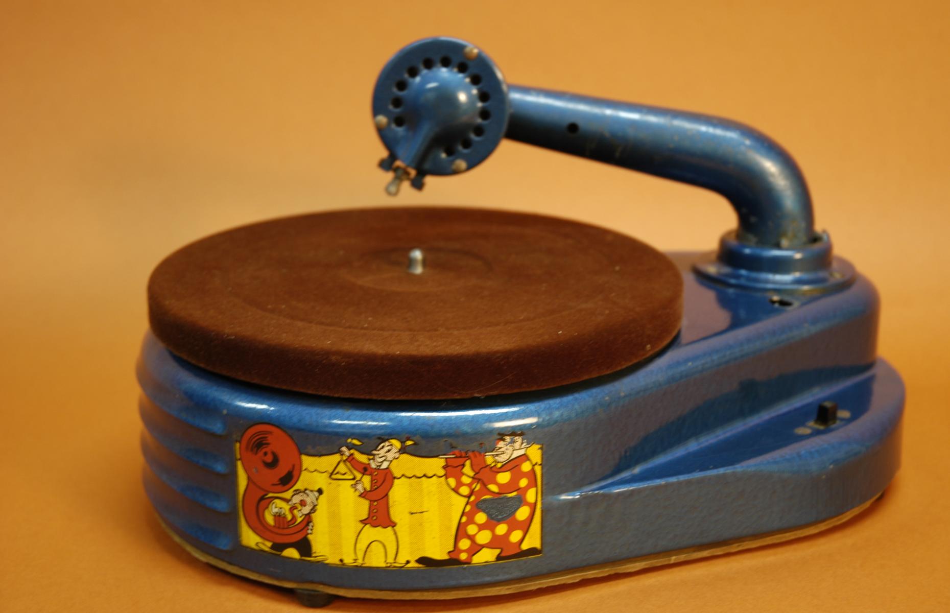 Kleingrammophon, 32 x 23 x 9,5 cm, dunkelblau. Plattenteller mit 22 cm Durchmesser und braunem Filzbelag. Elektromotorantrieb, Schalldose und Innen-Trichter. Im Boden Pappe mit aufgedruckten Hinweisen zur Benutzung. Auf beiden Seiten je ein gelber Aufkleber mit musizierenden Clowns.