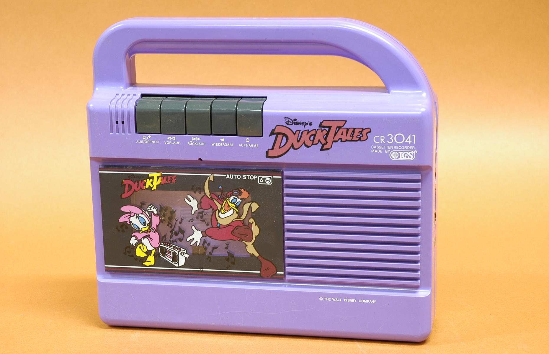 Tragbarer Kinderkassettenrecorder. Der Rekorder ist lila und hat ein Ducktales-Motiv auf dem Kassettendeck. Inklusive Mikrofon- und Kopfhörerausgang und Adapterbuchse für Netzteil.