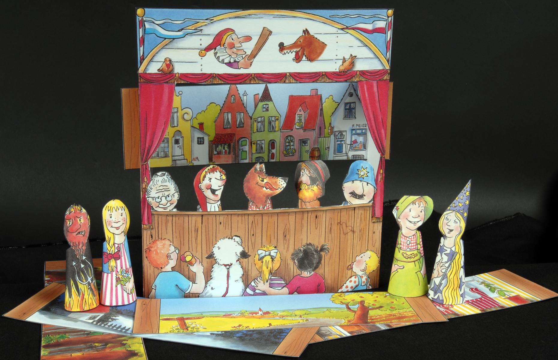 Das Set besteht aus 9 Fingerpüppchen (bekannte Figuren des Kaspertheaters), einer Bühne und fünf verschiedenen Kulissen. Design: Heike Wiechmann
