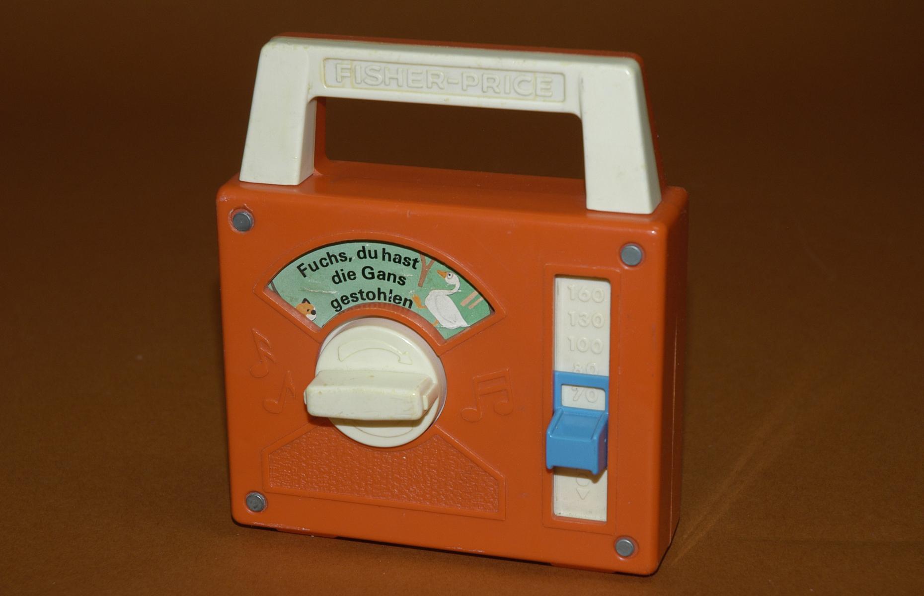 Spieluhr in Form eines Radios. Drehen des weißen Senderknopfs lässt Melodie und Bilderreigen abspielen. Die Spieluhr ist orange und weiß und besitzt einen Tragegriff. Auf der Rückseite befinden sich Illustrationen zum Kinderlied.
