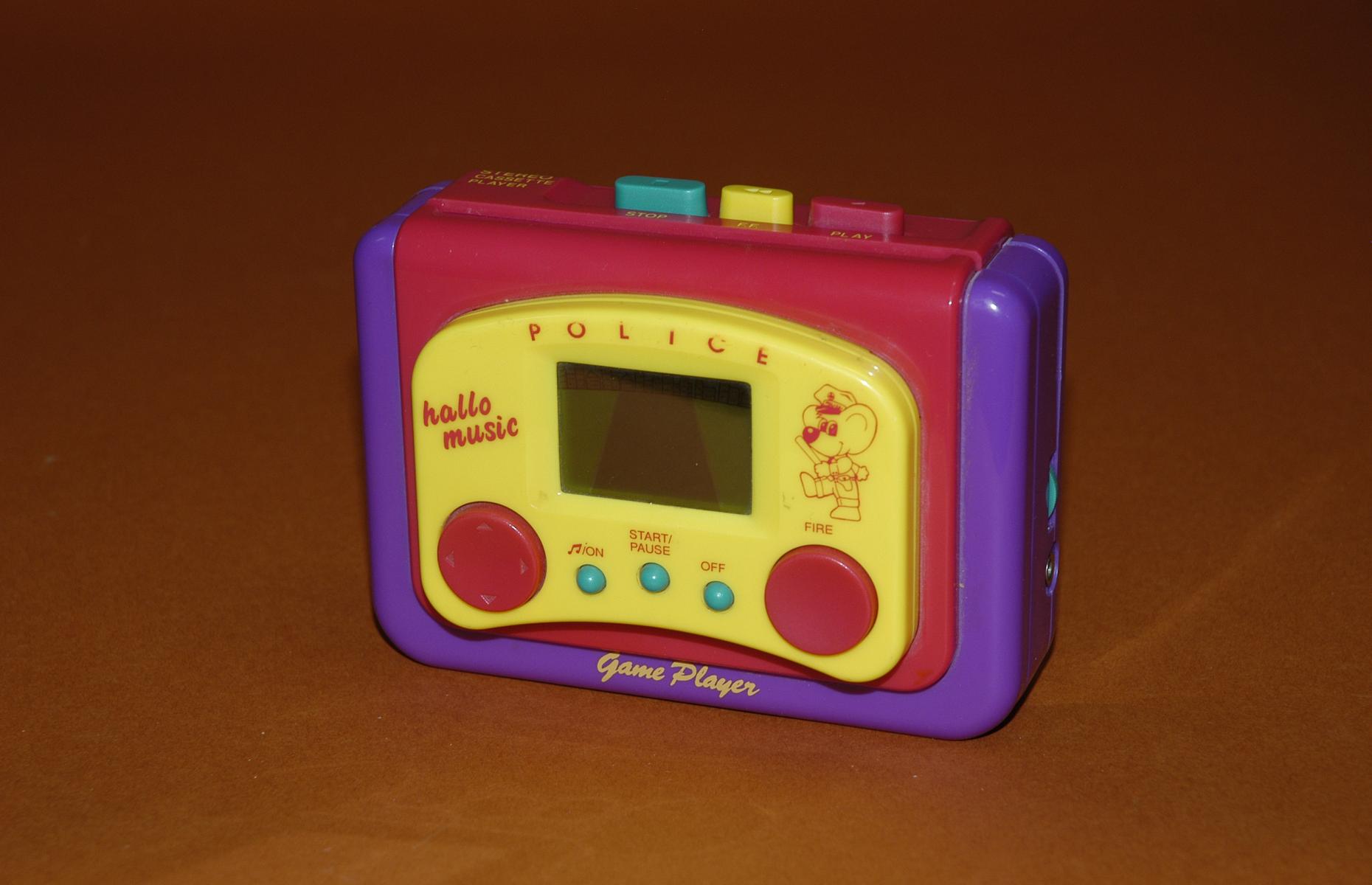 Kinderwalkman mit integriertem Game Boy-Spiel "Police". Auf dem Kassettendeckel befindet sich ein LCD-Display. Gesteuert wird das Spiel mit zwei Steuerungs-/Feuertasten. Die Farben des Walkmans sind gelb, pink und lila. Batteriebetrieben.
