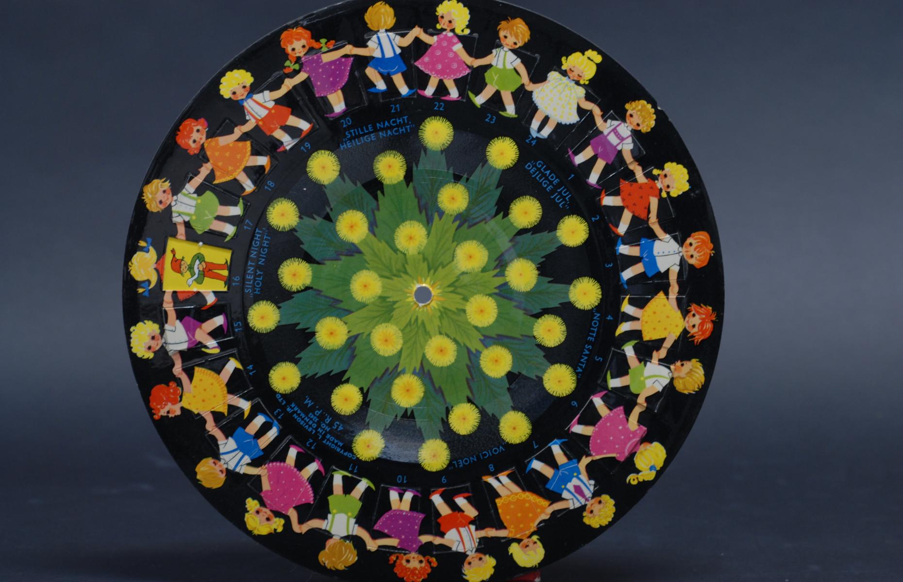 Schwarze Schallfolie mit bunten Illustrationen. Als Adventskalender zu benutzen. Durchmesser 25 cm (10 inch), auf der Rückseite mit Papier verstärkt. Geschwindigkeit: 45 rpm. Die Tonspur enthält das bekannte Weihnachtslied "Stille Nacht, Heilige Nacht". Am Rand der Schallfolie tanzen 24 Kinder einen bunten Reigen. In jedem Kinderkörper befindet sich ein auklappbares Türchen mit einer Illustration dahinter. Wie bei einem Adventskalender können die Türchen sukzessive täglich geöffnet werden.