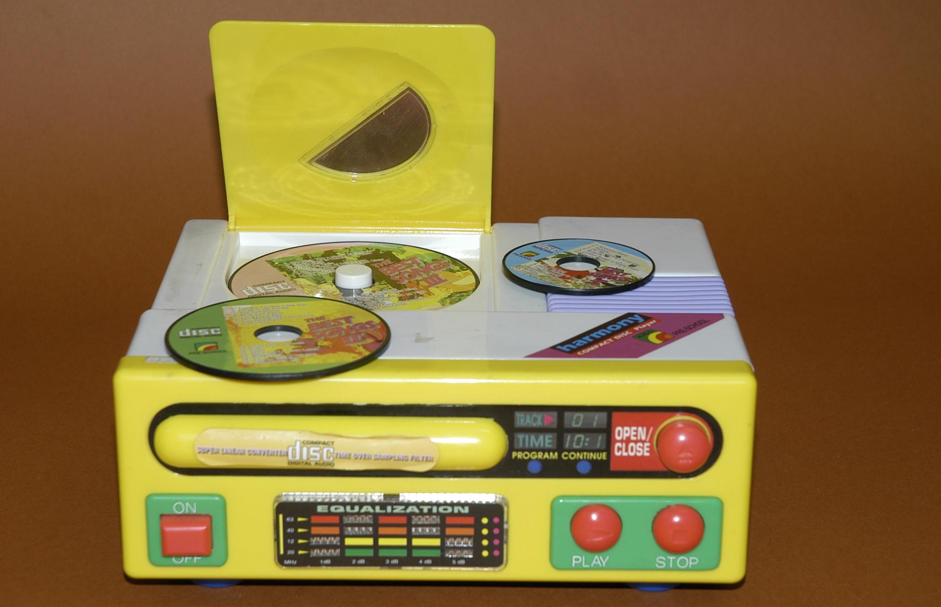 Kleiner Pseudo-CD-Player mit 3 Plastik-CDs: The Best Songs I-III. Weiß, gelb, blau; batteriebetrieben. Es handelt sich um einen Pseudo CD-Spieler, da die Plastik-CDs nur der Auslöser für ein vorher eingespeichertes Programm sind. Sie werden, wie bei einem richtigen Player ins ausfahrbare Ladefach gelegt. Zur Aufbewahrung dient ein Fach auf der Oberseite.