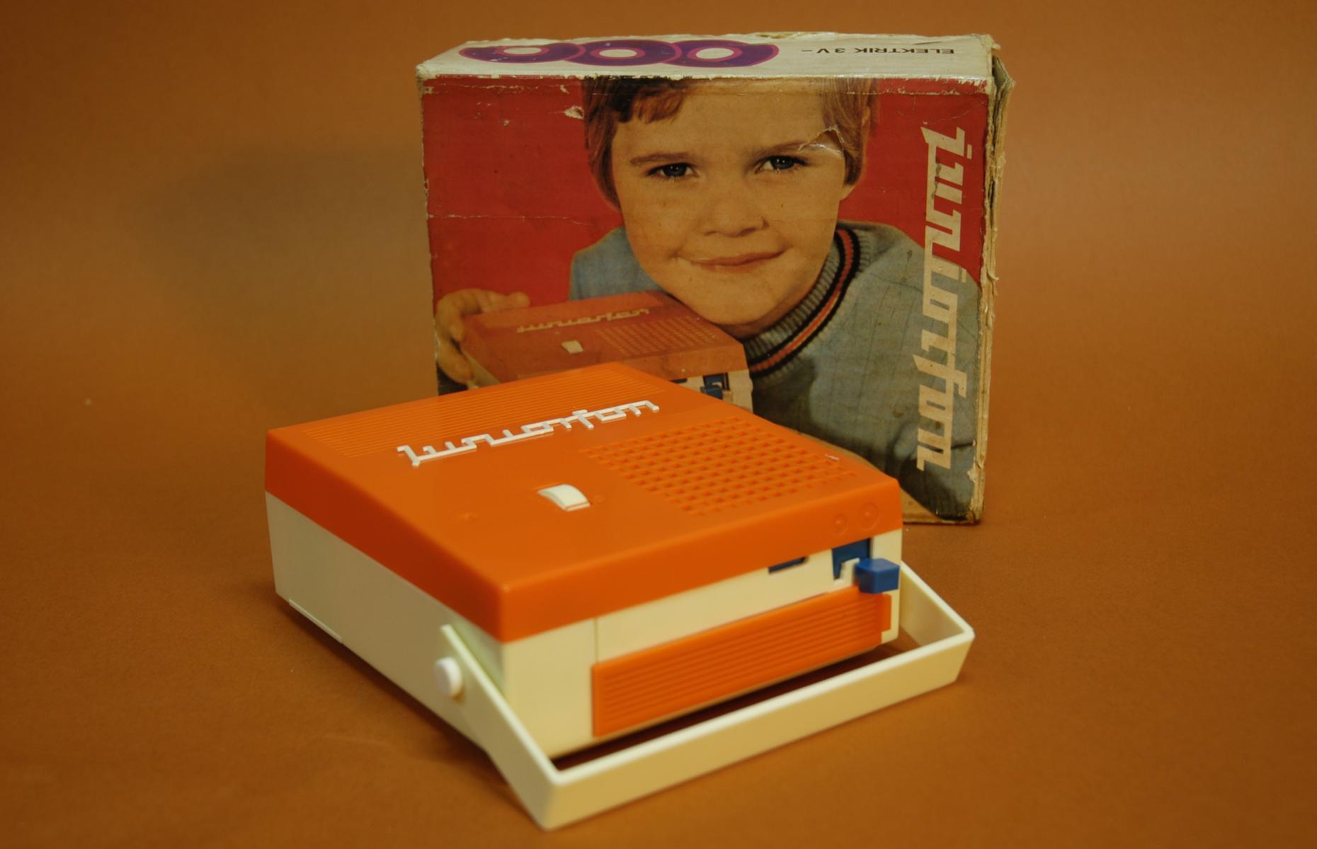 Plastikgehäuse, Thermoplast, orange und weiß. Der Plattenteller ist im Spieler und hat einen Durchmesser von 5,5 cm. Um eine Platte einzulegen, wird er ausgeklappt. Beim Einklappen senkt sich der Nadelarm ab. Tonabnehmersystem mit Stahlnadel (akustisch). Es sind zwei Schallplattengrößen möglich, die Größe ist an einem blauen Hebel am Spieler einstellbar. In Originalkarton mit Gebrauchsanleitung.