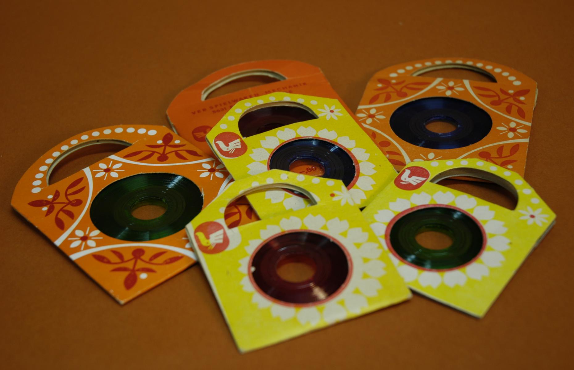 Überwiegend in Originalverpackung: orangefarbene (kleine Platten mit 5,8 cm Durchmesser) oder gelbe (große Platten mit 8 cm Durchmesser) Papphülle mit Tragehenkel. Die Platten im Einzelnen: