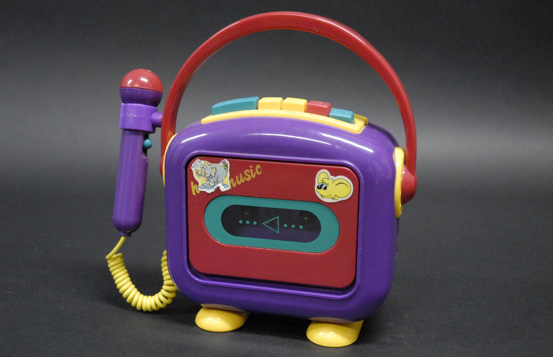 Kinderkassettenrekorder mit klappbarem Tragegriff, seitlich links angebrachtes Mikrofon. Korpus lila, tot-türkises Kassettendeck, gelber Henkel und gelbe Füße. Batteriebetrieben. Inklusive Netzbuchse. Lautsprecher auf der Rückseite.