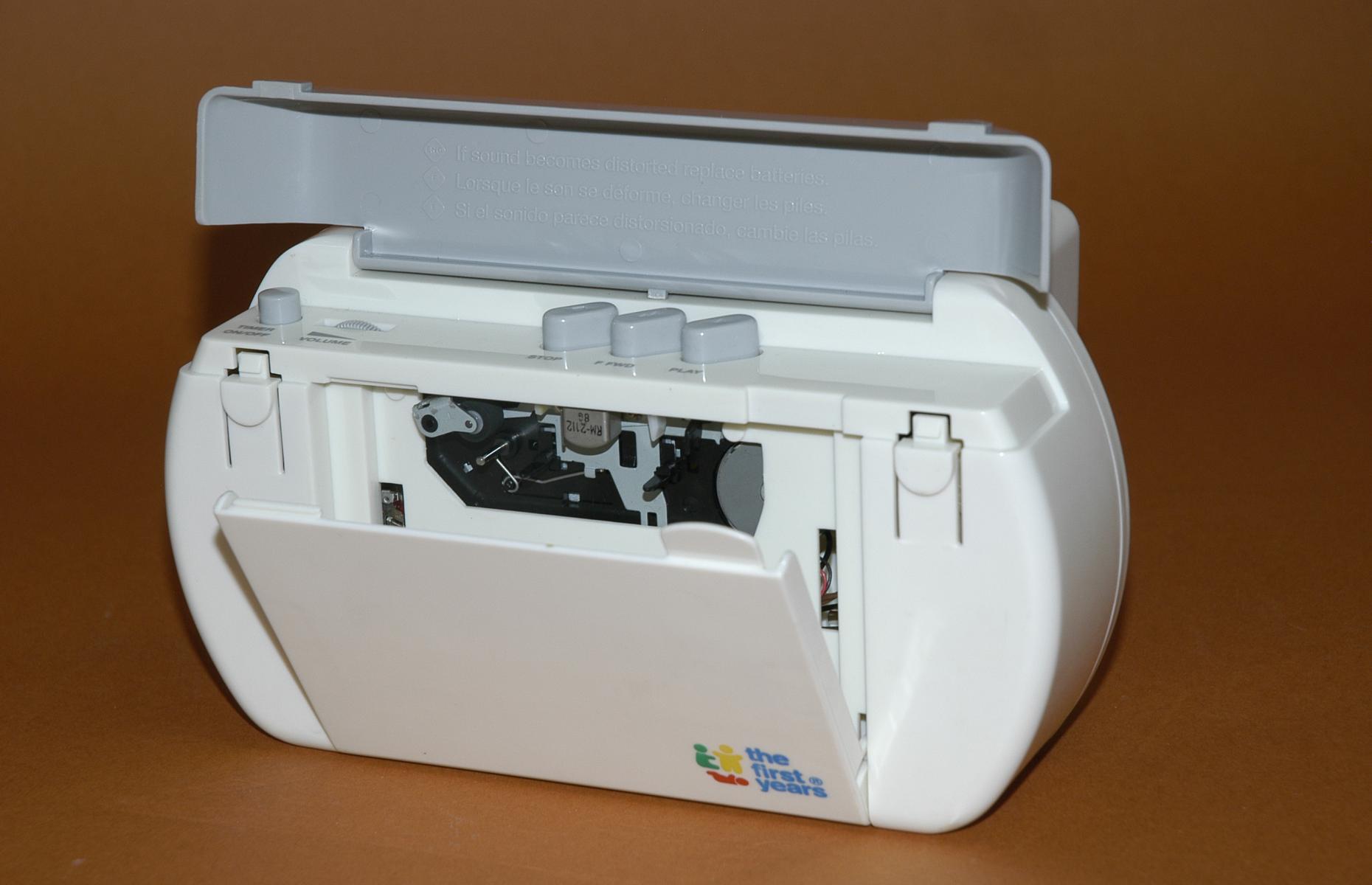Kassettenrekorder mit Bügel zum Befestigen am Kinderbett. Mit integrierter Beleuchtung. Der Kassettenrekorder ist weiß mit einem grauen Deckel.