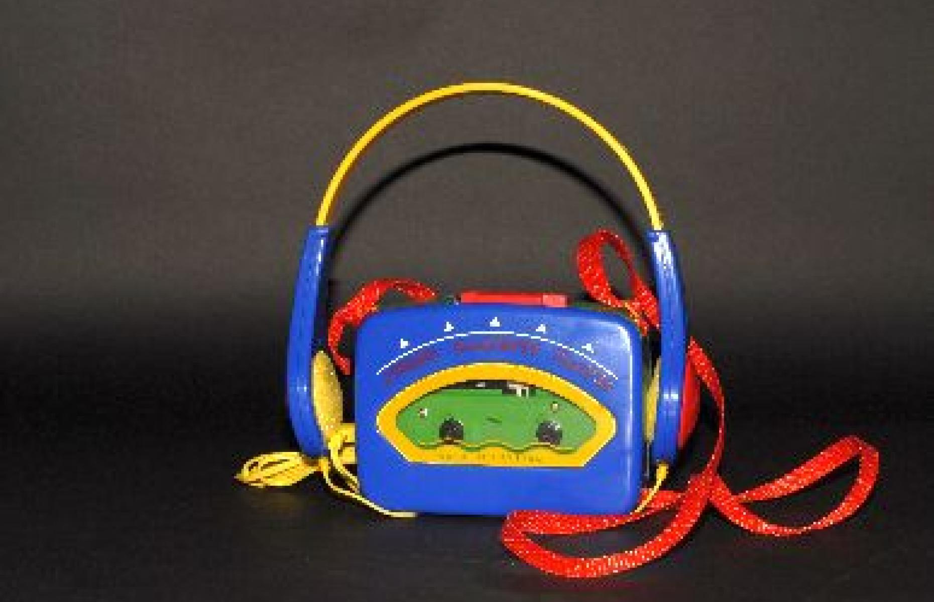 Blau-gelber Kinderwalkman mit Kopfhörer, Gürtelclip und Umhängeriemen.