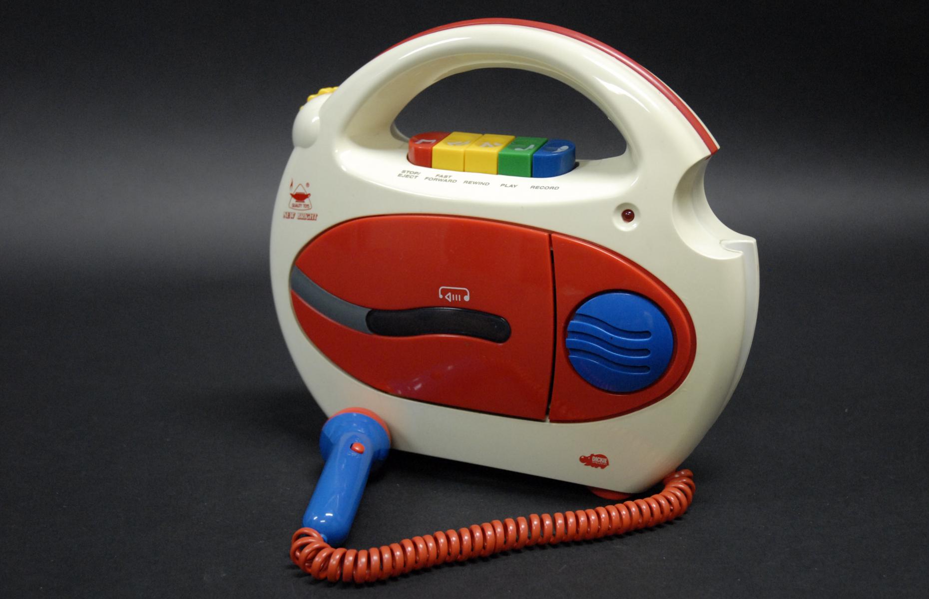 Kinderkassettenrekorder mit Tragegriff. Seitlich rechts angebrachtes Mikrofon. Elfenbeinfarben, rotes Kassettendeck, blauer Lautsprecher und Mikrofon. Batteriebetrieben. Inklusive Netzbuchse und Kopfhörerausgang. Auf der Rückseite Fach zur Aufbewahrung einer Kassette.