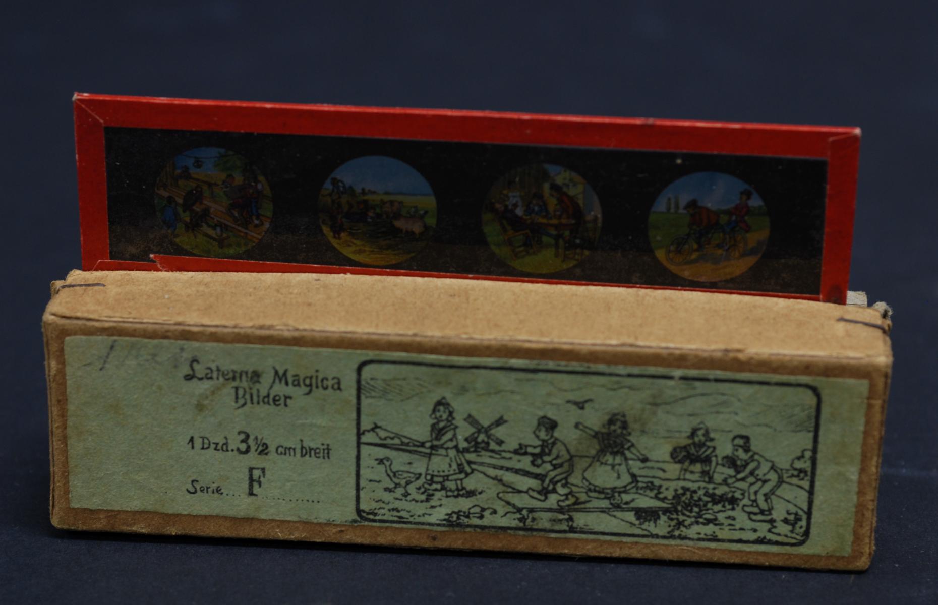 Jeder Glasstreifen (13 x 3,5 cm) zeigt ein farbiges (Landschafts)panorama: Kolonialszenen, Reiseansichten, lustige Begebenheiten. Aufschrift auf Etikett: "Laterna Magica Bilder, 1 Dzd. 3 1/2 cm breit, Serie F". Hersteller wahrscheinlich Bing. Von ursprünglich zwölf sind nur zehn Bilder enthalten.
