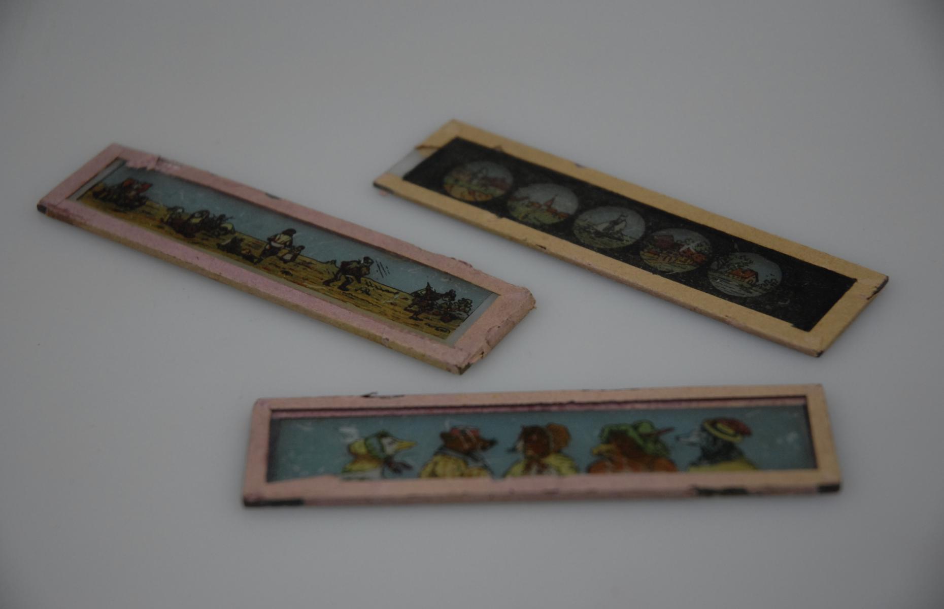 Jeder Glasstreifen (11 x 3 cm) zeigt fünf farbige Abbildungen: Lustige Szenen auf dem Feld; Als Frauen verkleidete Tiere; runde Landschaftsszenen.