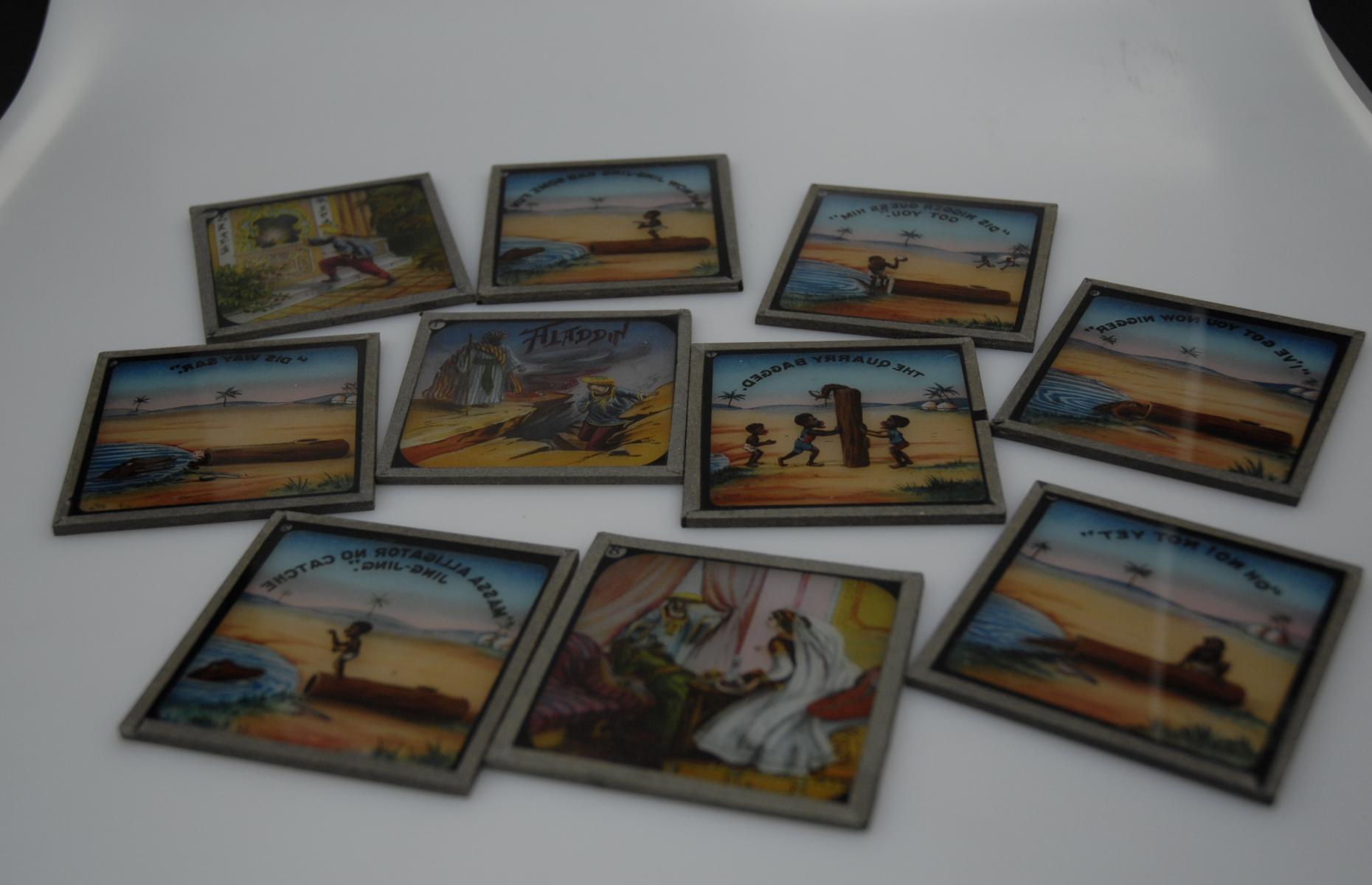 Die Bilder zeigen Szenen des Märchens "Aladdin" und stellen Teil 772 der Reihe " Primus Junior Lecturer's Lantern Slides Series B" der britischen Firma W. Butcher & Sons London dar. Die Sets von acht Bildern wurden zusammen mit dem Text der Geschichte in einer Pappschachtel verkauft.