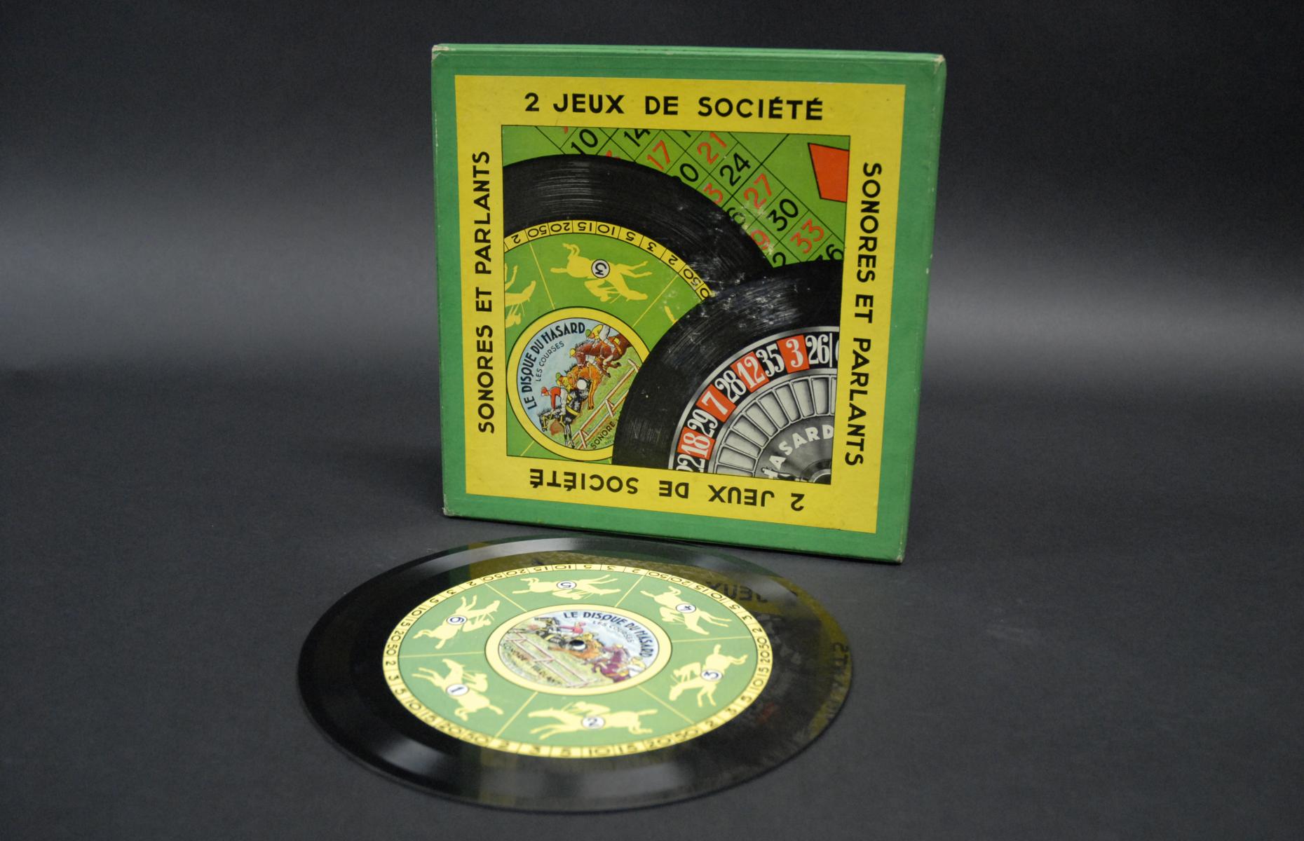 Gesellschaftsspiel mit Schallplatte: "2 Jeux de Société sonores et parlants". Eine 78rpm-Platte in grünem Karton. Auf den Innenseiten des Kartons je ein Spielfeld für Roulette, "La Roulette" und Pferderennen "Les Courses". Auf den Spielfeldern werden die Einsätze gemacht. Die Platte enthält den Aufdruck eines Roulette-Zylinders bzw. der Rennpferde mit ihren Startnummern und Einlaufrängen. Nun kann auf der Platte das Renn- bzw. Casinogeschehen angehört werden. Am Ende der Aufnahme wird der Plattenteller gestoppt. Das Pferd/die Zahl, auf die der Tonarm zeigt, gewinnt.