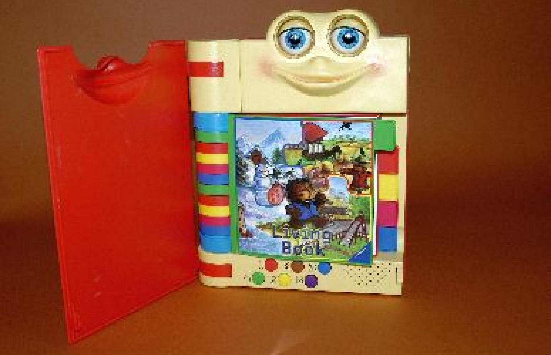 Rotes Talking Book mit Kulleraugen und beweglichem Mund, Trageband. Das lebende Buch enthält 24 interaktive Abenteuergeschichten, Farb- und Zahlenspiele und Kinderlieder. Durch Umblättern der Seiten werden die Geschichten angewählt, das Buch erläutert, was auf der Seite getan werden kann. Durch Drücken der Tasten kann gerätselt und in die Geschichte eingegriffen werden. Erweiterbar durch Zusatzbücher.