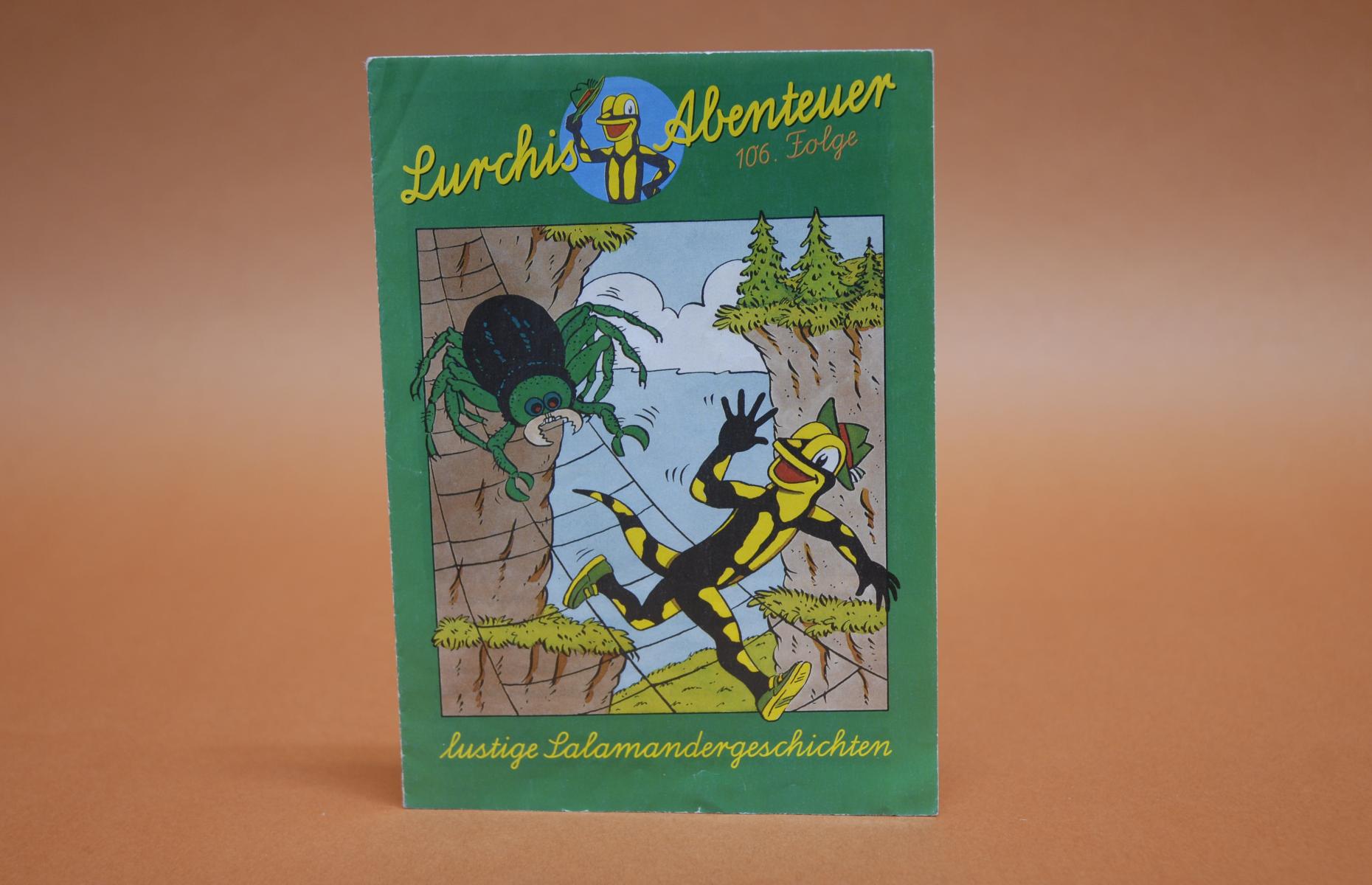 Viele bunte Illustrationen, Texte in Reimform und Schreibschrift. Manche Wörter rot gedruckt (z.B. "Salamander").