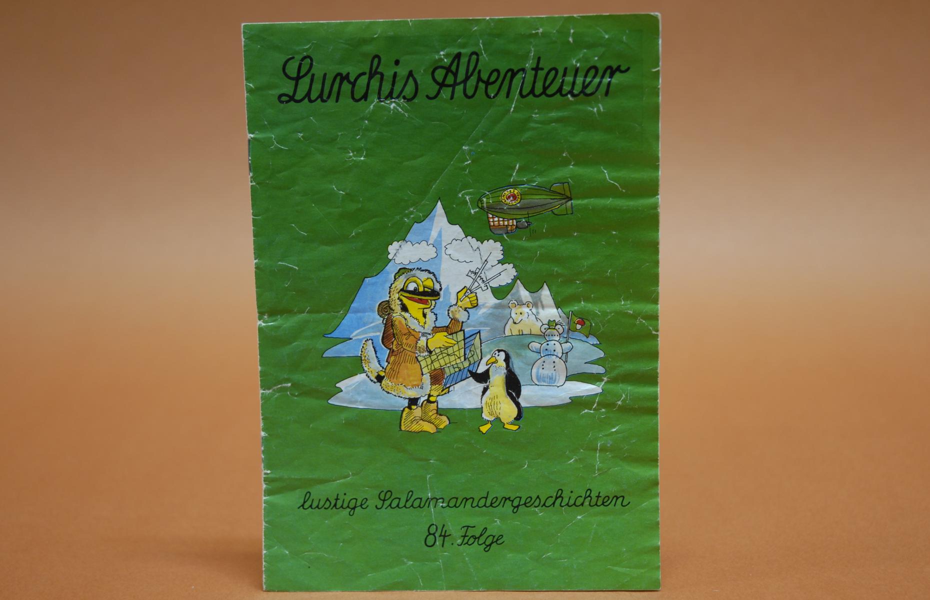 Titel der Folge steht im Heft: "Fahrt zum Südpol". Viele bunte Illustrationen, Texte in Reimform und Schreibschrift. Manche Wörter rot gedruckt (z.B. "Salamander").