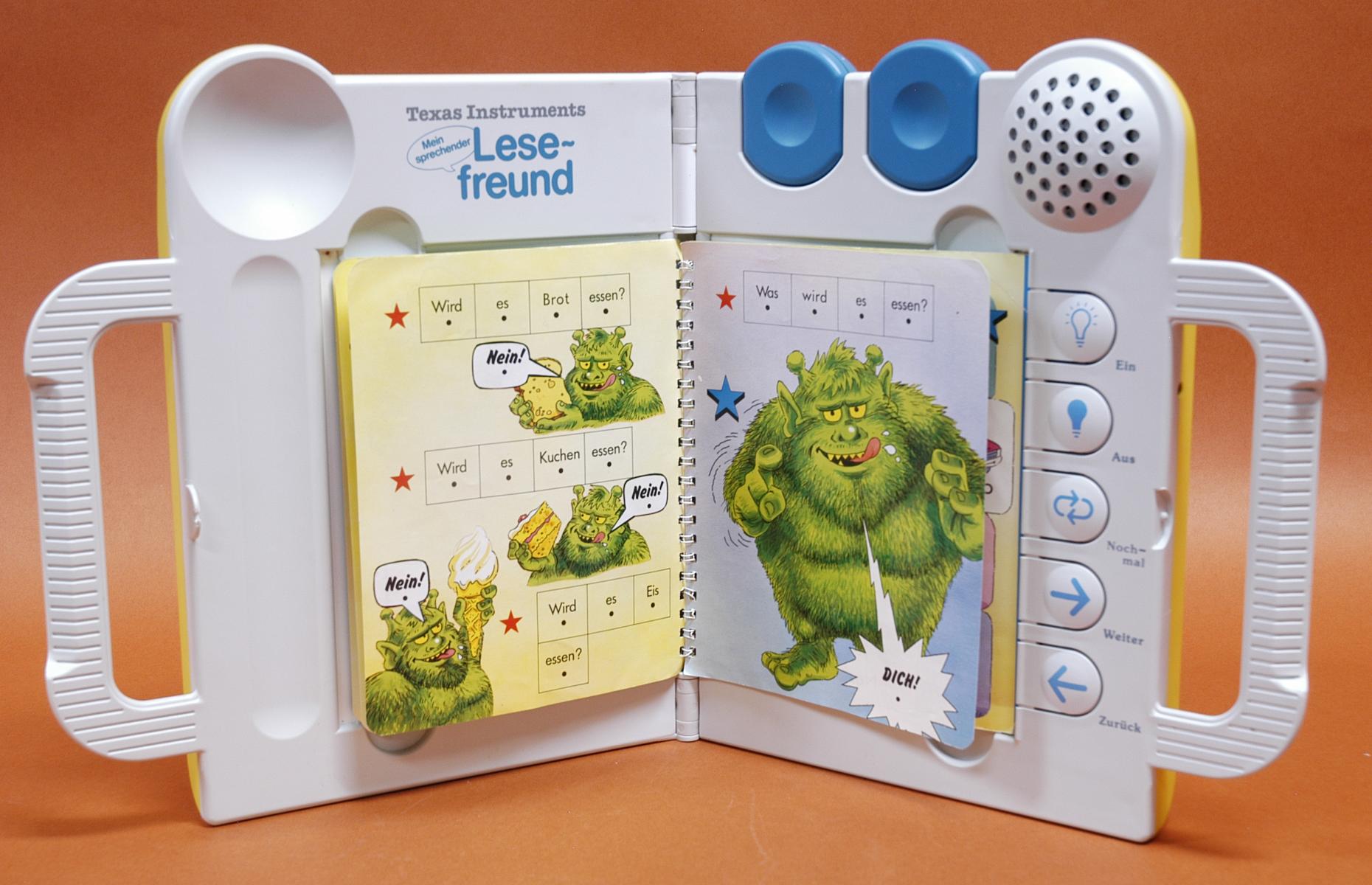 Talking Book, Basisstation in Form eines gelben Koffers. Inkl. sieben Aktivitäts-Büchern: Hallo Freunde, Schimmis Geburtstag, Das grüne Monster, Löwenspaß, Bei Familie Löwe, Große Pläne kleiner Löwe, Das Versteckspiel. Kombination von Buch und Elektronik. Der Lesefreund liest Geschichten vor, wenn der Text der Aktionsbücher durch Berühren mit dem Finger aktiviert wird. Lerneffekt: Buchstabieren, Lautieren, Lesen, Zahlen. Erweiterbar durch Zusatzbücher.
