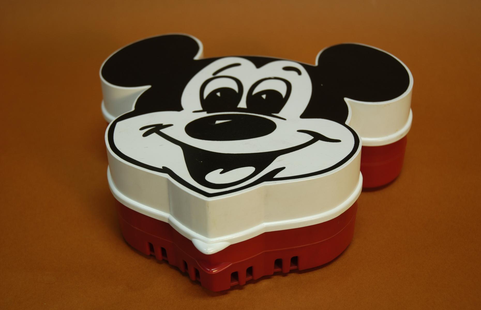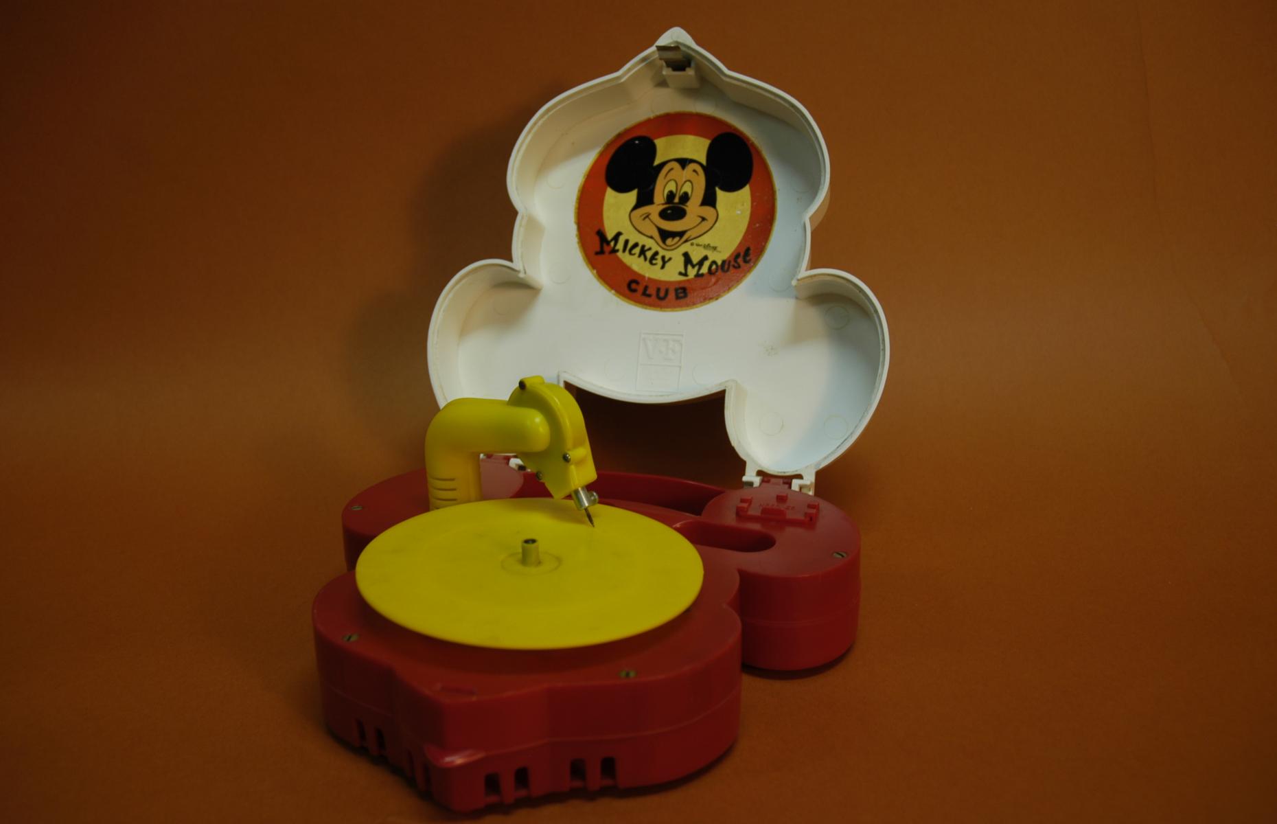 Tragbarer Kofferplattenspieler in Form eines Mickey Mouse Kopfes; Deckel weiß, Korpus rot. Batteriebetrieben. Tonarm muss zum Abspielen eingesetzt werden, zum Schließen wird er im Gehäuse verstaut. Extra Aufbewahrungsfach für Ersatznadeln. Verwendet Stahlnadeln.
