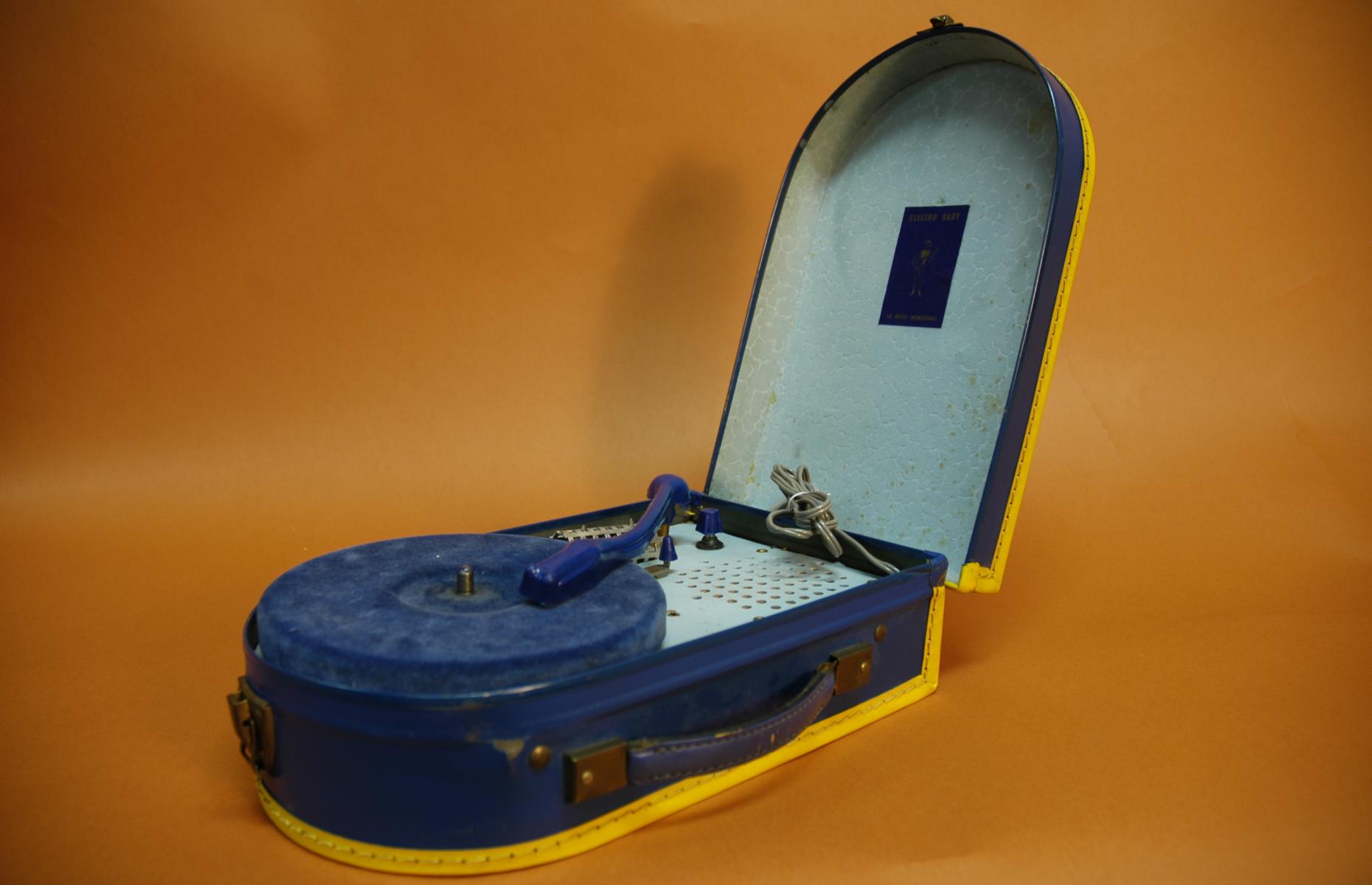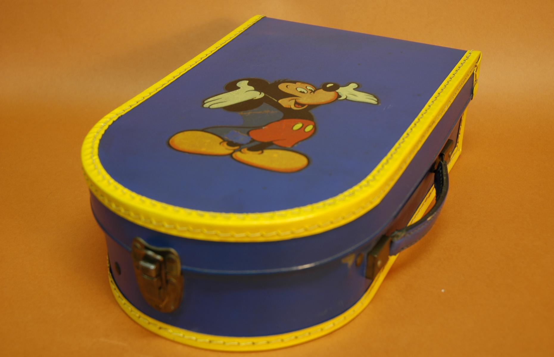 Tragbarer Kofferplattenspieler, halboval. Blaues Kunstleder mit Mickey Mouse Motiv. Plattenteller aus blauem Samt, zwei Geschwindigkeitsstufen "N" und "M", zwei Leuchtmittel hinter Gitter, französischer (?) Netzstecker.