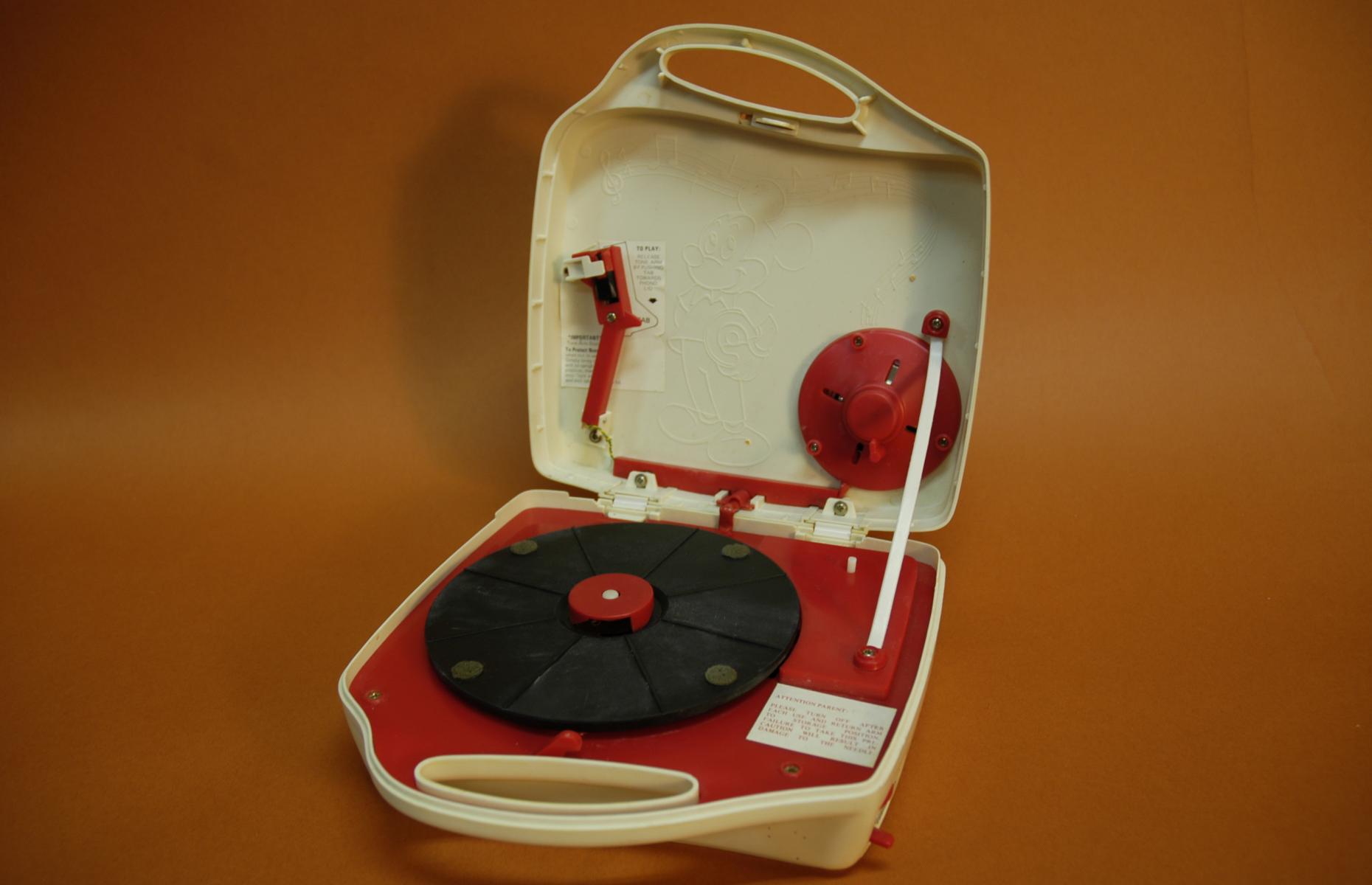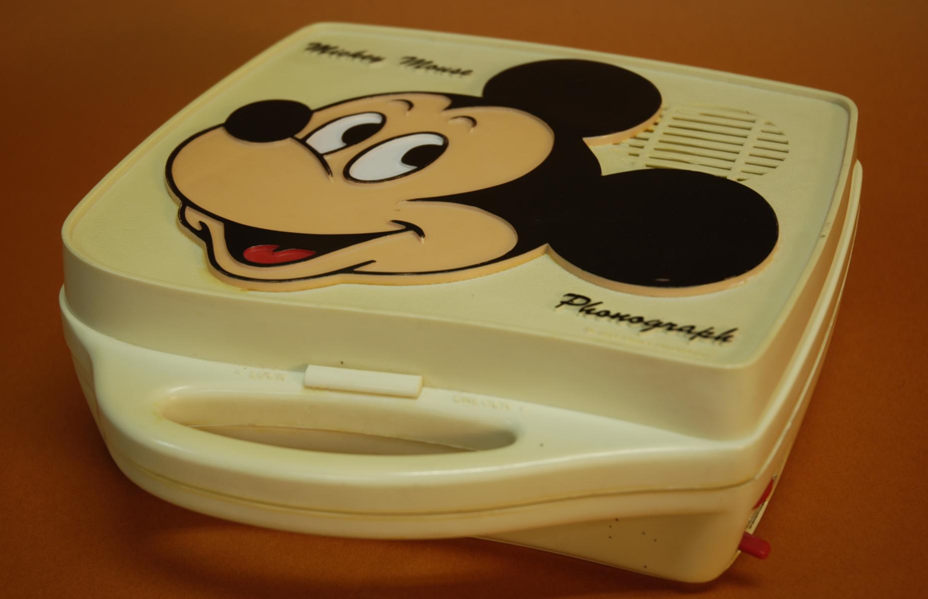 Tragbarer weißer Kofferplattenspieler. Auf dem Deckel Mickey Mouse Kopf. Lautsprecher in Deckel integriert; batteriebetrieben. Der Deckel muss zum Abspielen geschlossen werden. An der Seite Lautstärke und Geschwindigkeitsregler. Spielt Singles und Mini-Schallplatten.