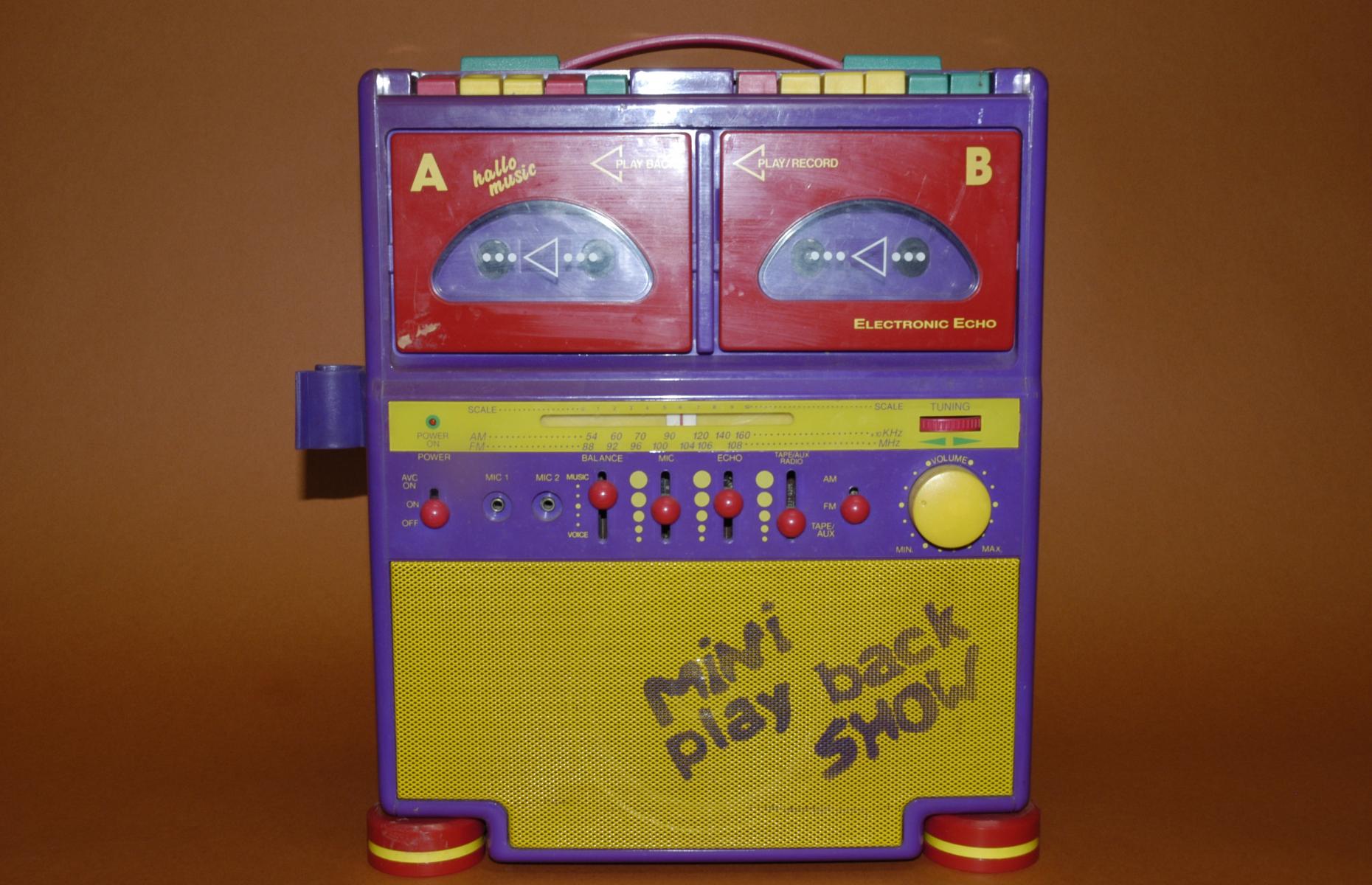 Großformatiger Radiorecorder mit zwei Kassettendecks in Form eines Stereoturms. Der Recorder betsitzt ein Mikrofon, ein Netzkabel und einen Echoeffekt. Die Farben des Recorders sind lila und bunt.