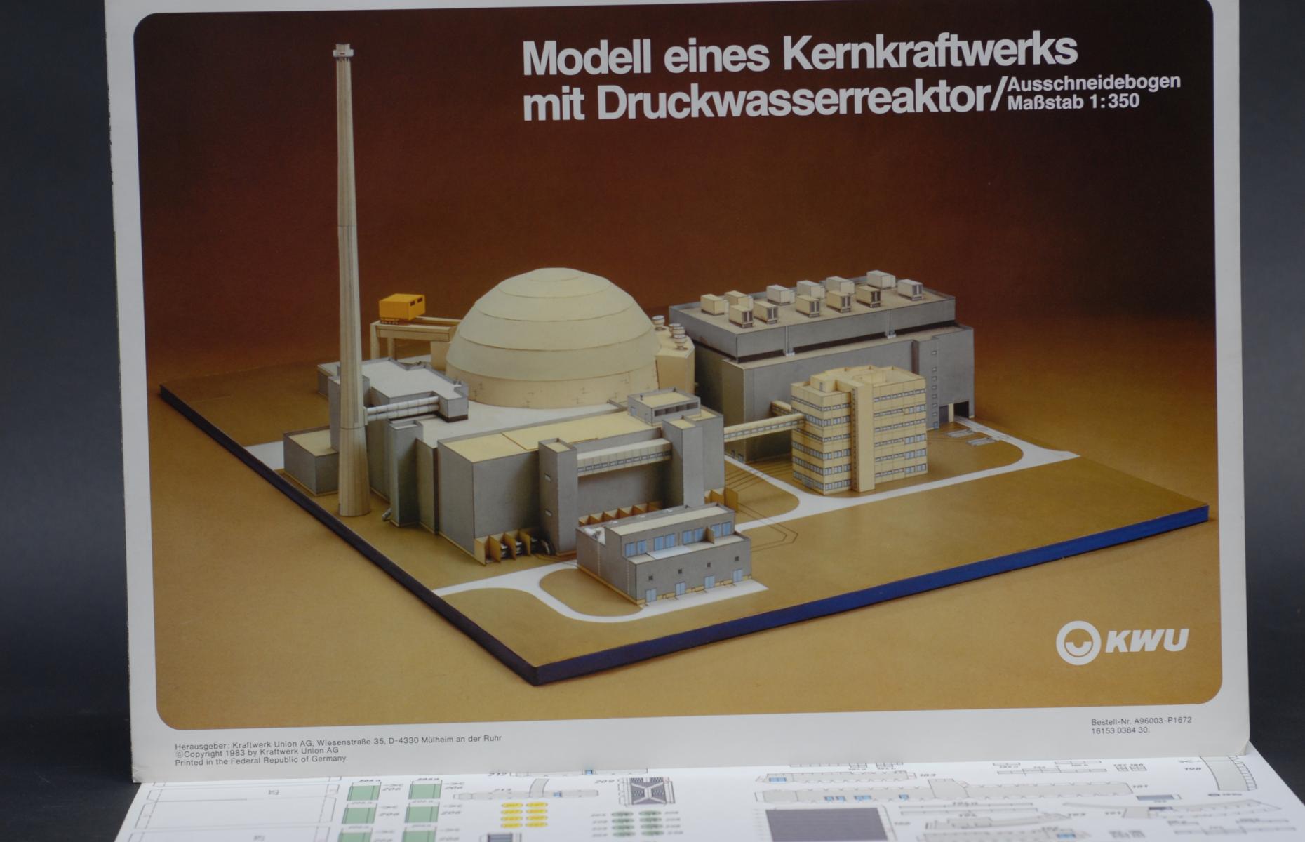 Originalgetreues Modell eines Kernkraftwerks des Typs "DWR 1300 MW" auf 18 Bogen. Inklusive Bauanleitung und Informationen zur Funktionsweise des Atomkraftwerks.