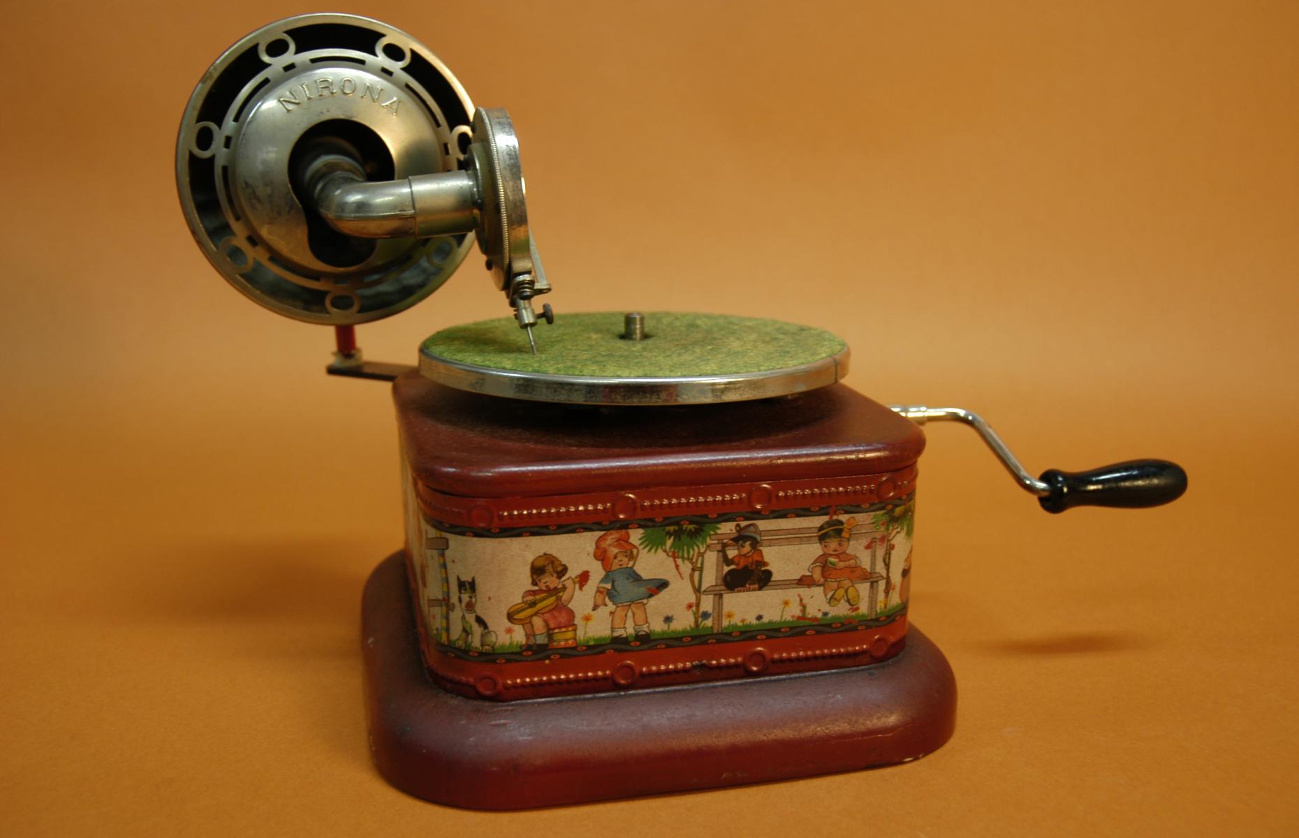 Viereckiges Kleingrammophon, weinrot, Plattenteller mit 15 cm Durchmesser und grünem Filzbelag. Federwerkantrieb mit Kurbel, glockenförmiger Schallverstärker, der als sogenannter Umkehr-Trichter den Ton reflektiert. Zwei Geschwindigkeiten einstellbar. Im Mittelteil punziertes lithographiertes Stahlblech, bedruckt mit spielenden Kindern und Tieren.