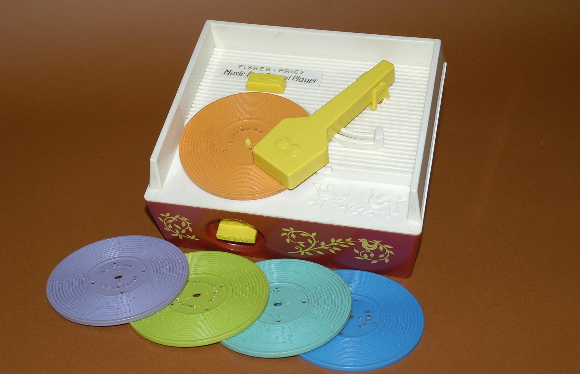 Spieluhr in Form eines Plattenspielers. Rot, weiß, gelber Tonarm. Inkl. fünf beidseitig abspielbarer Plastikplatten. In den Rillen der Plastikplatten sind Tonzungen angebracht. Unter dem Tonarm befindet sich die Walze, die beim Drehen des Plattentellers die Melodie erzeugt. An der Vorderseite kann die Dose aufgezogen werden. Die Platten werden in einer Vertiefung auf der Rückseite aufbewahrt.