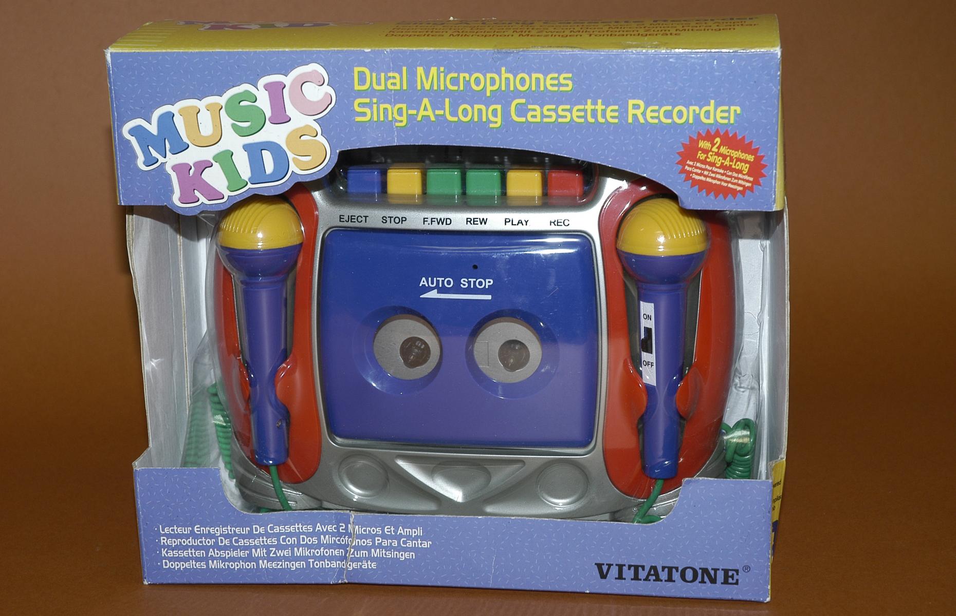 Kinderkassettenrekorder mit zwei Mikrophonen. Der Kassettenrecorder ist silber und blau. Batteriebetrieben