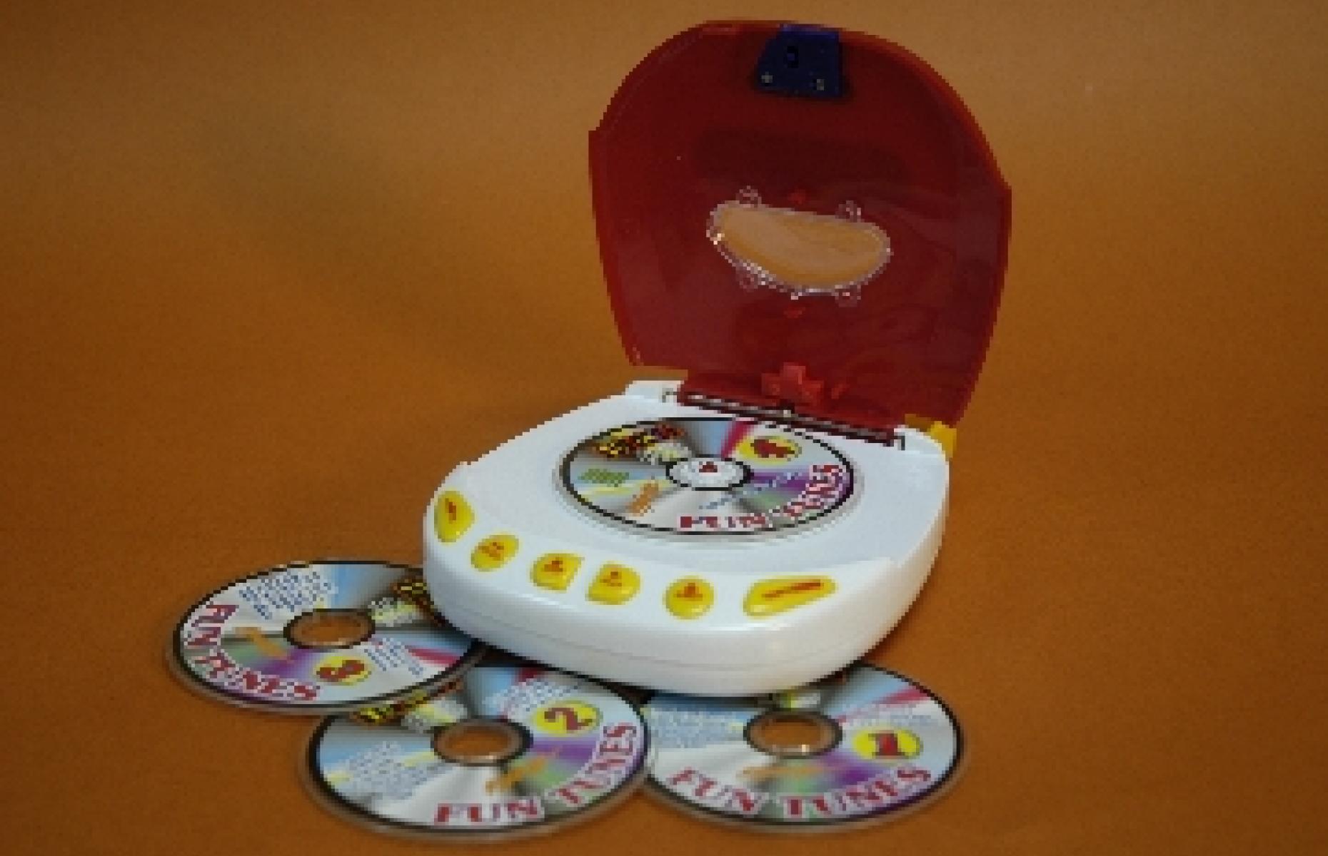 Kleiner tragbarer Pseudo-Discman mit 4 Plastik-CDs. Der Discman besitzt einen ausfahrbareren Tragegriff und ist rot-weiß. Batteriebetrieben. Es handelt sich um einen Pseudo CD-Spieler, da die Plastik-CDs nur der Auslöser für ein vorher eingespeichertes Programm sind. Tasten: Play/Stopp, Eject, Select, Tempo, Volume. Inkl. der CDs Fun Tunes 1-4.