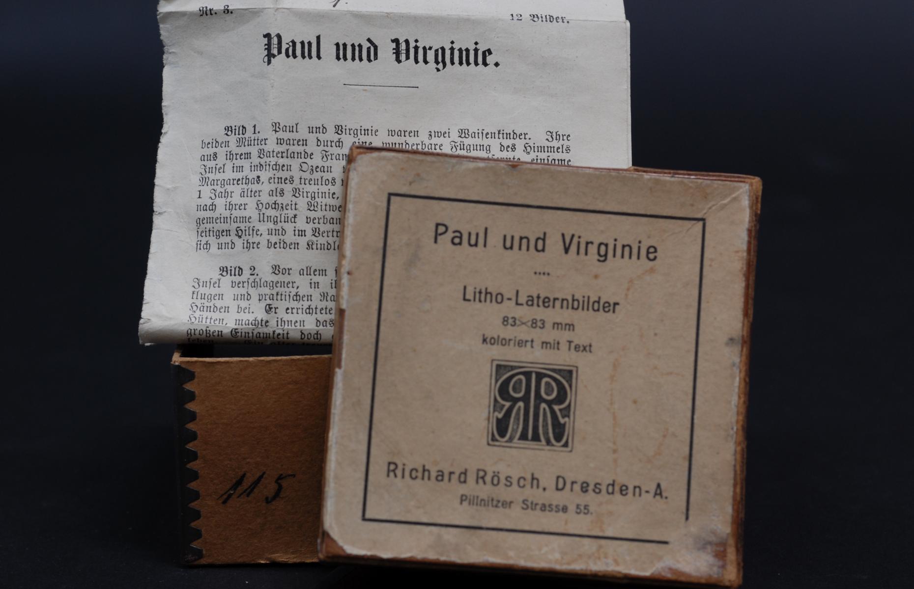 Jedes Bild zeigt eine Szene der Geschichte von "Paul und Virginie" nach Jacques Henri Bernardin de Saint-Pierre. Die Bilder sind in der rechten oberen Ecke durchnummeriert. Auf der Rückseite befindet sich am unteren Rand das Markenzeichen und der Schriftzug des Herstellers "Richard Rösch, Dresden-A. 10". Dazu zwei lose Blätter mit Begleittext zu den einzelnen Bildern in Fraktur. Die 1789 veröffentlichte Geschichte von "Paul und Virginie" wurde bis zum heutigen Tag zahlreich neu aufgelegt, übersetzt, dramatisiert und vertont und diente als Vorlage für viele Gemälde und Stiche. In den 1970er Jahren wurde der Stoff in einer populären Fernsehserie verarbeitet. Zur Handlung: Die aus verschiedenen Gesellschaftsschichten stammenden Protagonisten wachsen unbeschwert durch Standesdenken in der tropischen Idylle von Mauritius auf und verlieben sich ineinander. Als Virginie nach Frankreich zieht, müssen sie sich für immer trennen und die Geschichte nimmt ein tragisches Ende.