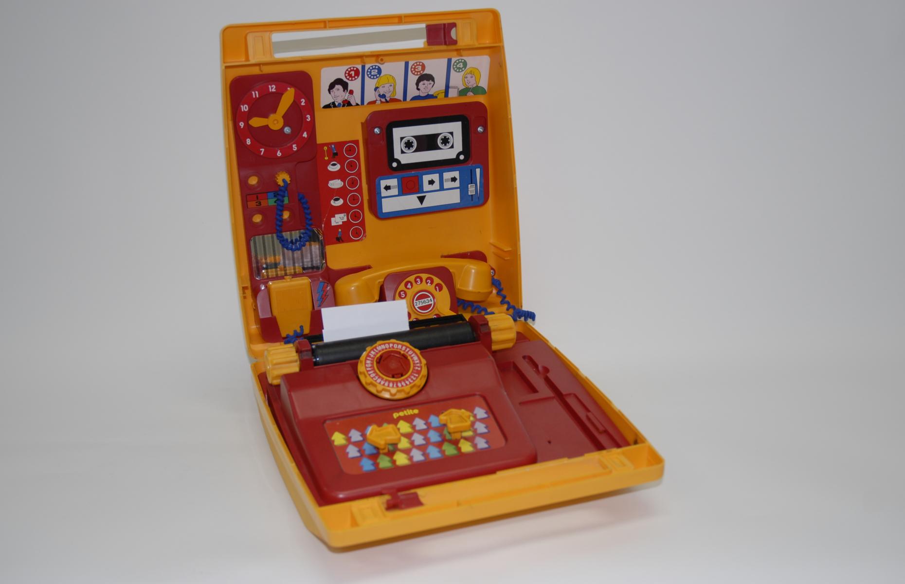 Spielzeugbüro in gelbem Koffer. Funktionen: Dial-Schreibmaschine, Telefon, Uhr, Spitzer, Kassettendeck, Funkgerät.