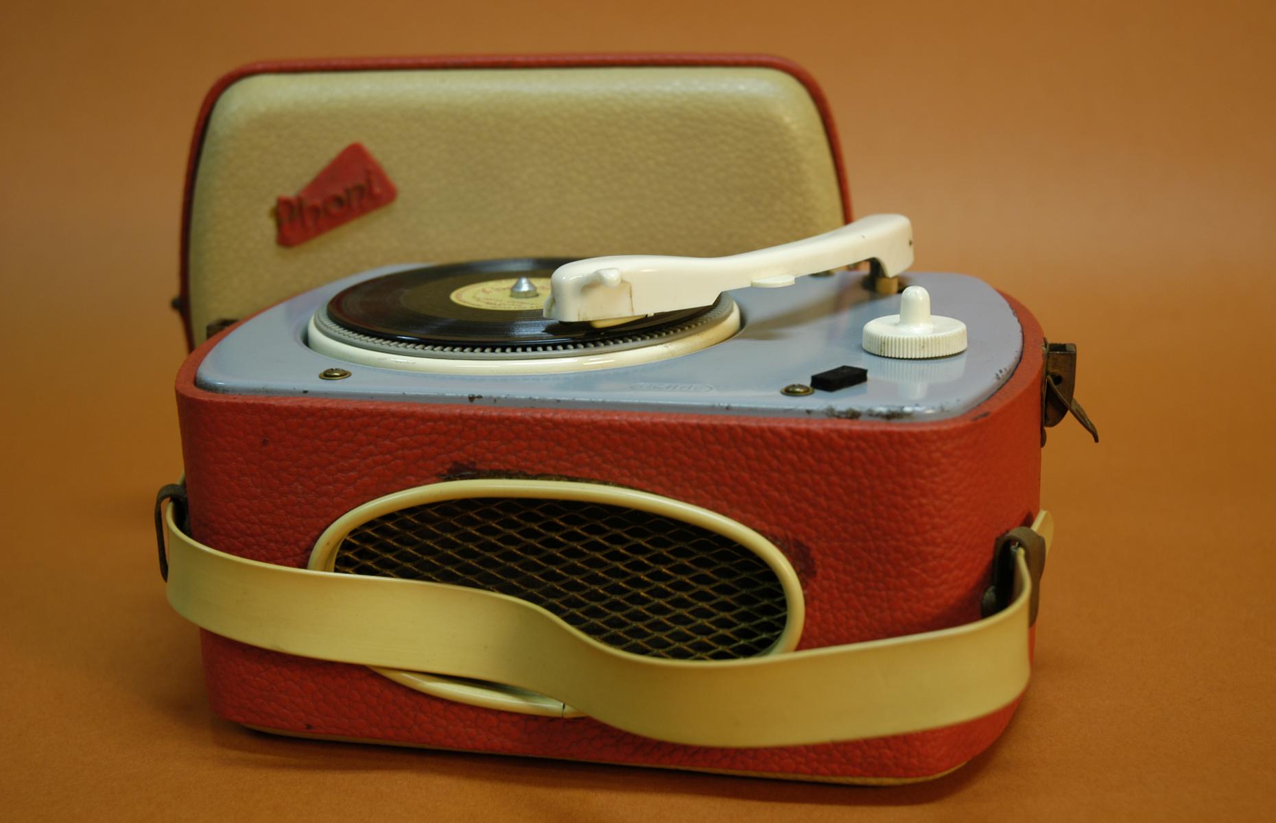 Tragbarer Kofferplattenspieler, mit Kunstleder bezogen, 22 x 15 x 11,5 cm, Durchmesser des Plattentellers 11 cm. Lautstärkeregler an der Seite, Lautsprecher an der Vorderseite, Plastiktragegurt. Zum Abspielen von Mini-Schallplatten. Rot und beige, ein weißer Drehknopf. Batteriebetrieben.