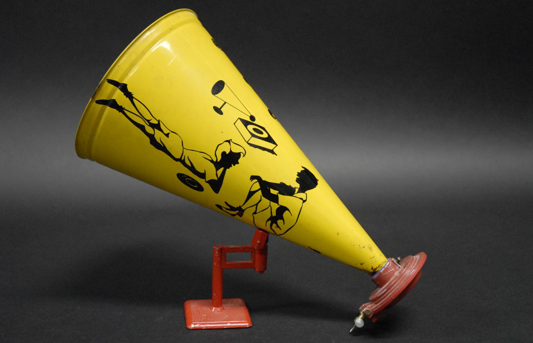 Gelber Schalltrichter mit Schneidstichel zum Selbstschneiden von Grammophonplatten aus Wachs. Länge 27 cm, Durchmesser 14 cm.