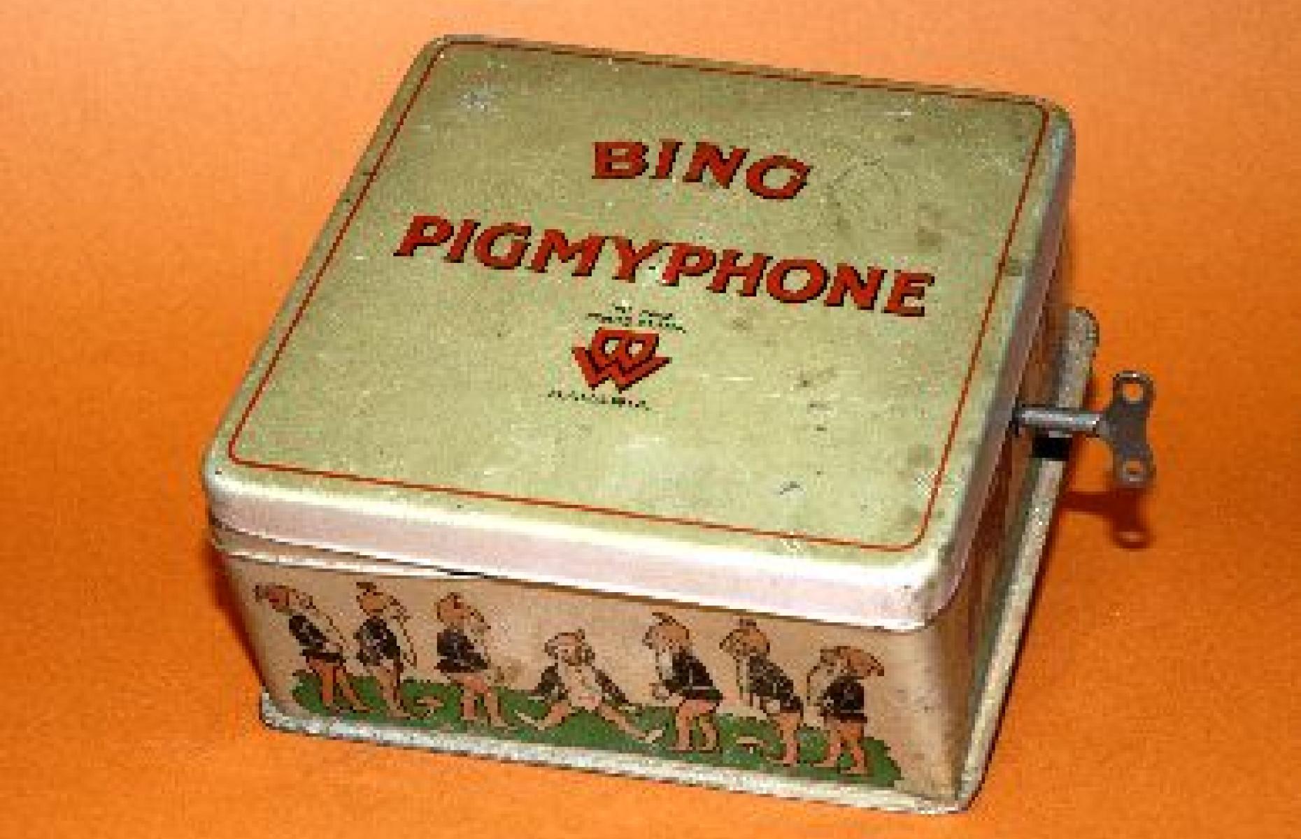 Kindergrammophon in quadratischem Blechbehältnis; 165 x 72 x 165 mm. Für Platten bis 17 cm Durchmesser geeignet, Federwerkantrieb; Tonarm abnehmbar. Bemalt mit Jazzmusikern, Rotkäppchen und den Sieben Zwergen.