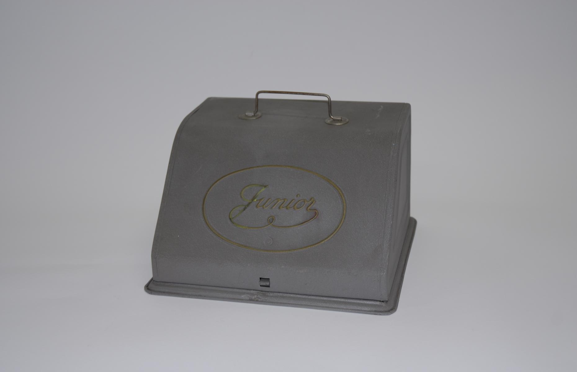 Dial-Schreibmaschine. Die Tastatur ist nur Atrappe, die Buchstaben werden über das Drehrad ausgewählt. Der untere Hebel wechselt von Klein- auf Großbuchstaben.