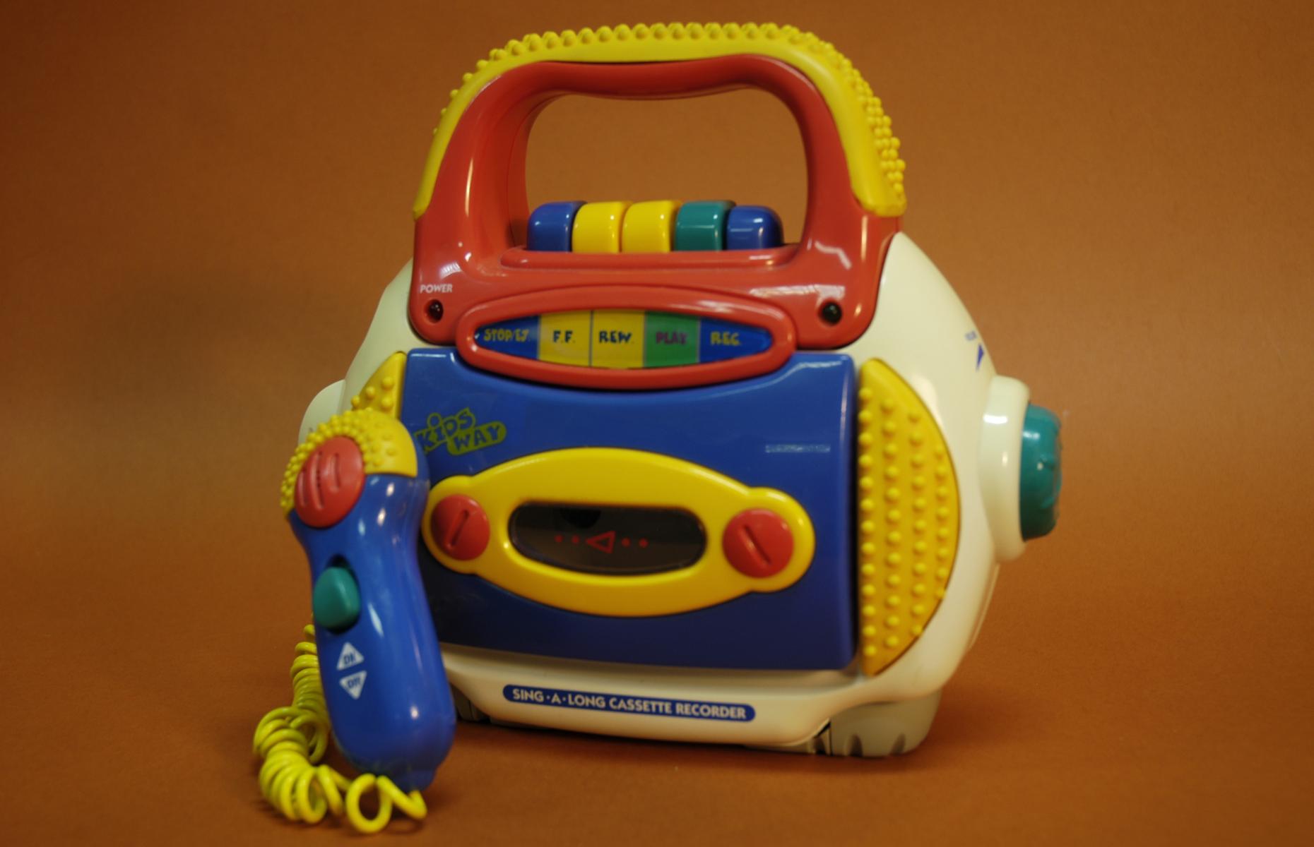 Kinderkassettenrekorder mit seitlich angebrachtem Mikrofon und Tragegriff. Der Rekorder ist weiß und bunt mit gelbem Noppengummi. Batteriebetrieben.