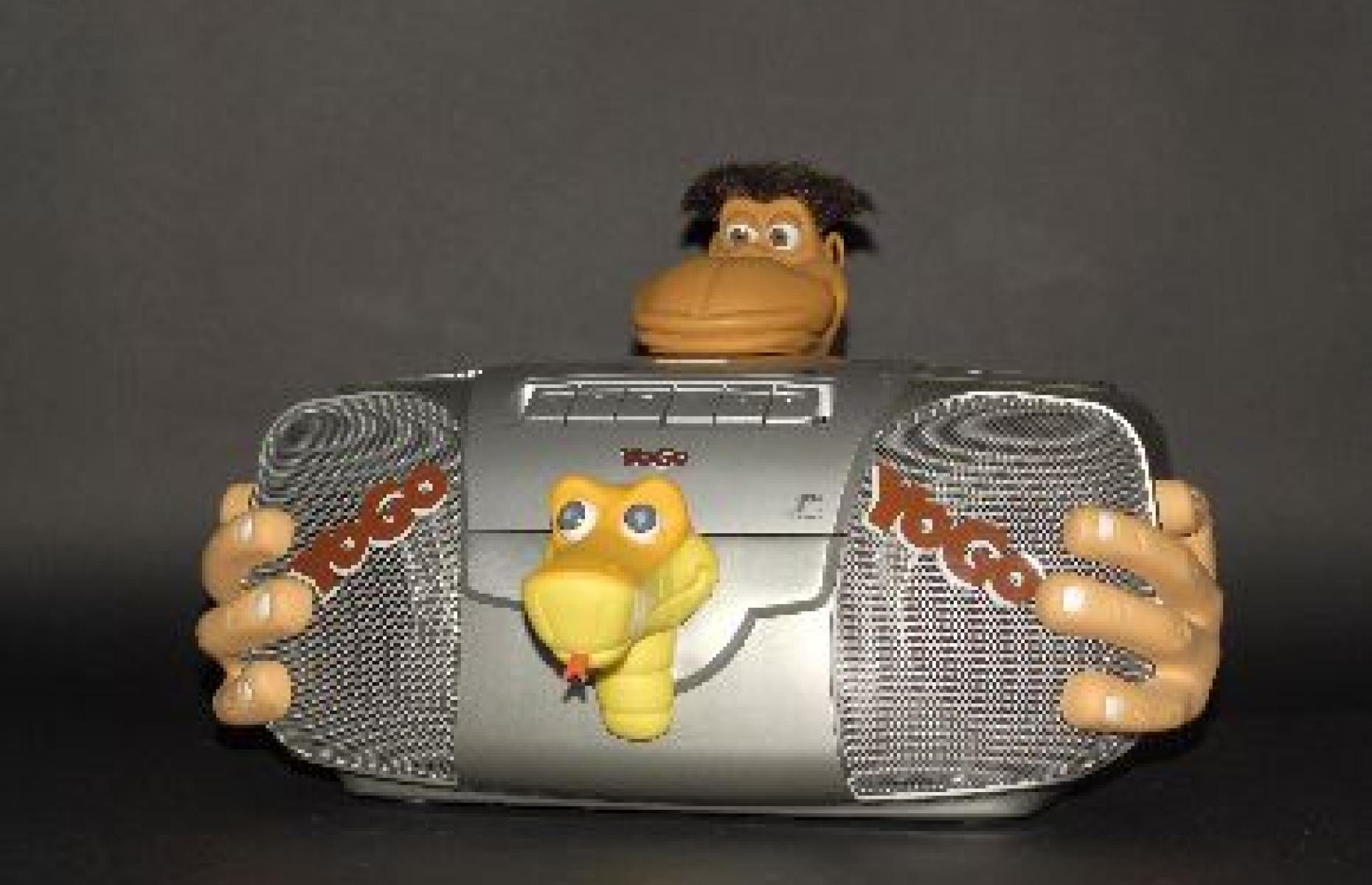 Ans Dschungelbuch angelehnte Figurenköpfe (Schlange, Affe) auf den Deckklappen.