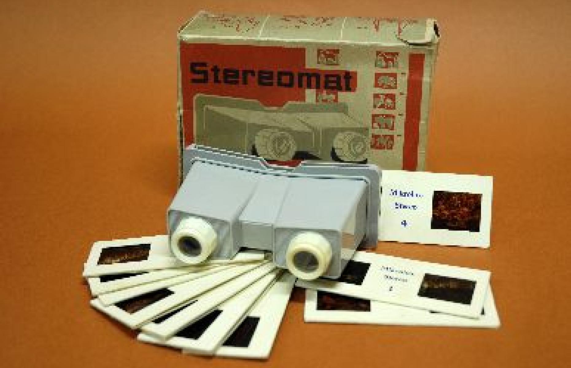 Der Stereomat war ein in der DDR produziertes Stereobildsystem. Anders als beim Viewmaster, befindet sich auf den rechteckigen Bildkarten je nur ein Stereobild in zwei Einzelbildern. Die Karten werden nacheinander oben ins Gerät geschoben.