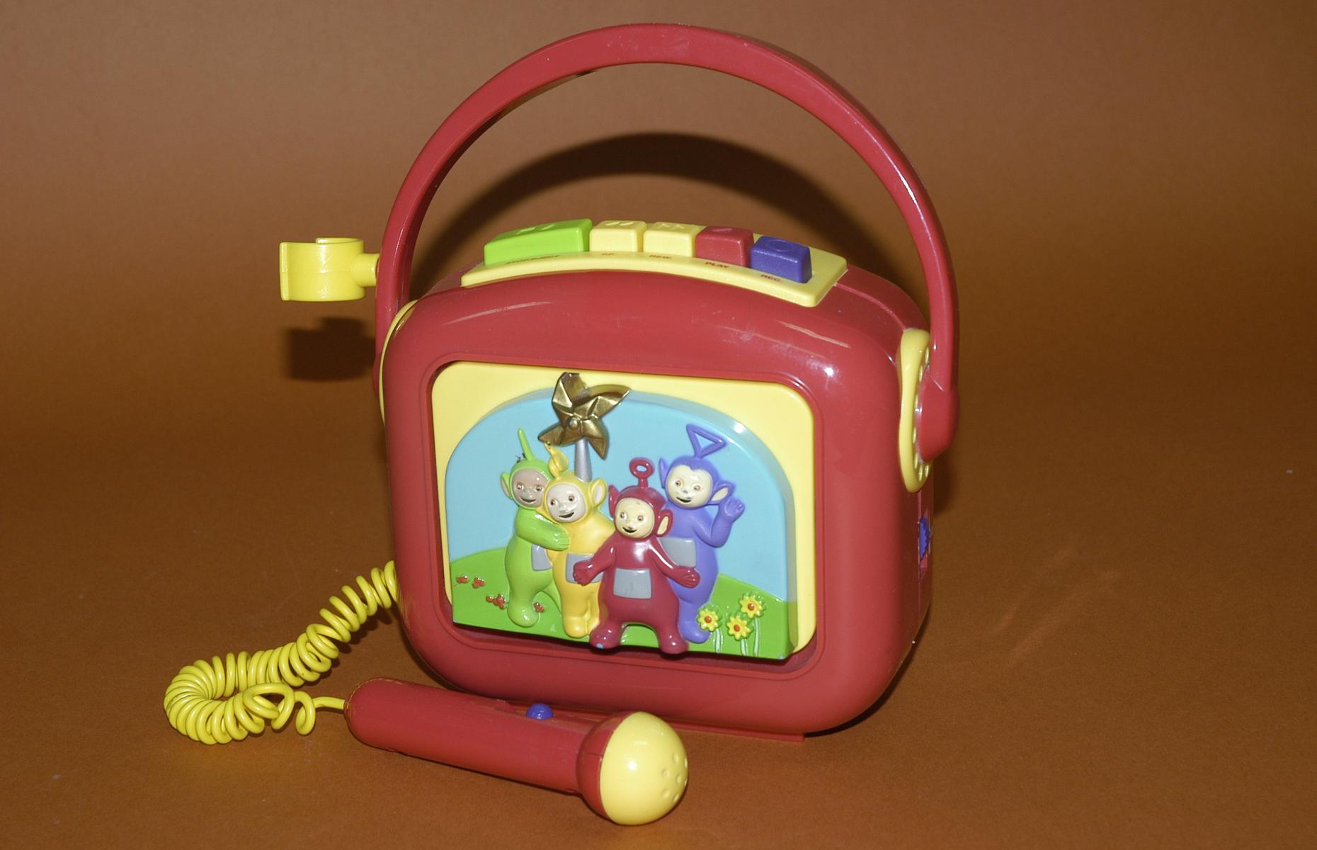 Rot-gelber Kassettenrekorder mit Tragehenkel und Mikrofon. Auf der Kassettendeckklappe Motiv der Teletubbies .