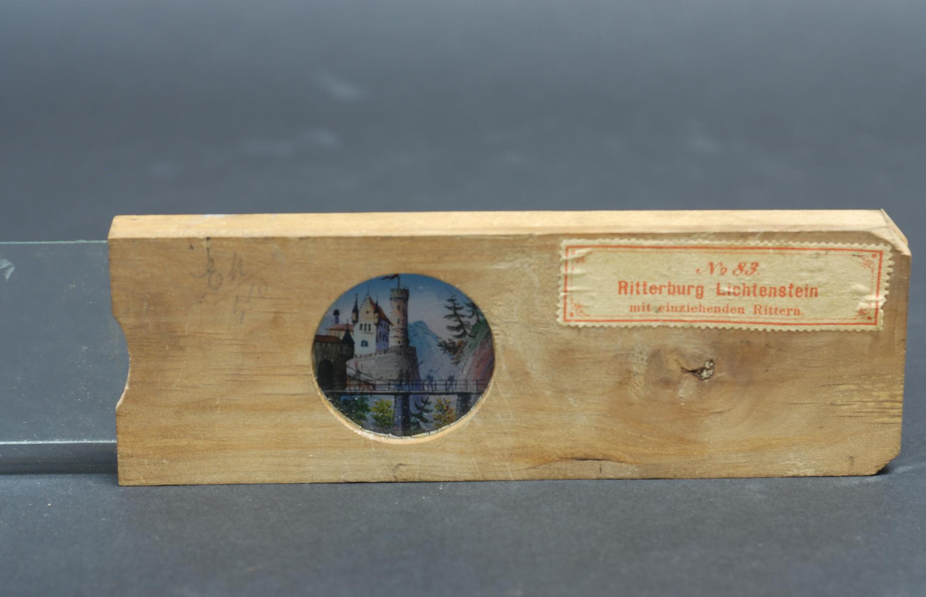 Hinter einer kreisrunden Aussparung des Rahmens befindet sich ein fixiertes Glas mit einer Abbildung der Burg Lichtenstein. Dahinter wird ein Glasstreifen entlang gezogen, auf den eine Prozession von Rittern zu Pferde aufgemalt ist. Durch das Durchziehen des Glasstreifens ensteht der Eindruck der Bewegung. Auf dem Holzrahmen ist ein Aufkleber mit dem Titel und "No. 83" angebracht.