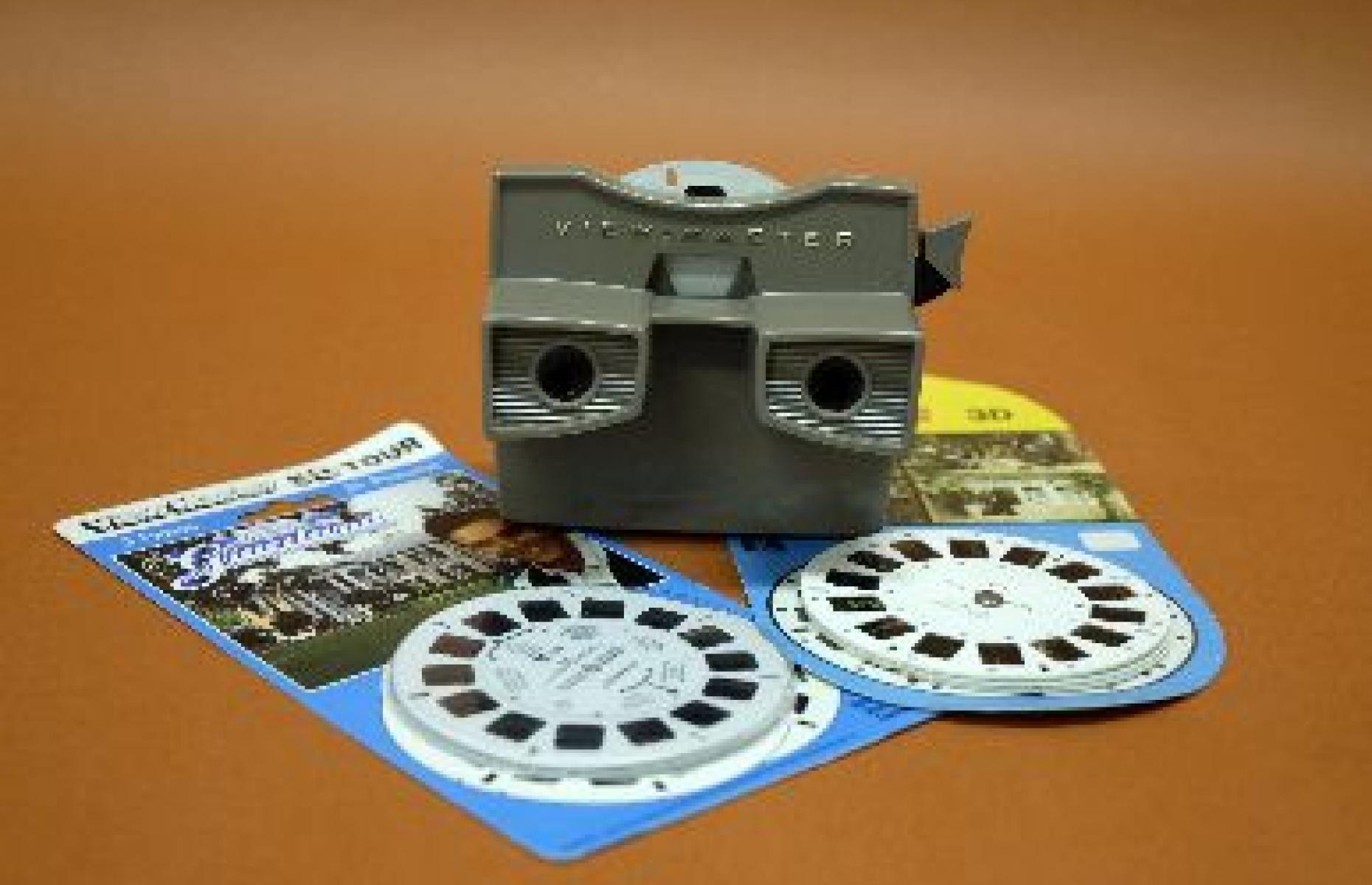 Betrachtungsgerät mit zwei Gucklöchern und integrierten kleinen Linsen, das direkt vor die Augen gehalten wird. Die Bilder sind in Form von Dias auf eine Pappscheibe aufgebracht. Die einzelnen Scheiben auch "Reels" genannt, bestehen aus sieben Stereo-Bildpaaren. Nach dem stereoskopischen Prinzip wird jedem Auge eine jeweils leicht unterschiedliche Version desselben Bildes gezeigt, sodass ein dreidimensionaler Eindruck vermittelt wird. Für den Betrachter scheint sich dadurch ein kleiner Raum zu öffnen, indem eine greifbare Welt existiert. Die Funktionsweise des View-Masters hat sich bis heute nicht grundsätzlich geändert. Der seitlich angebrachte Hebel dient zum Drehen der Scheibe.