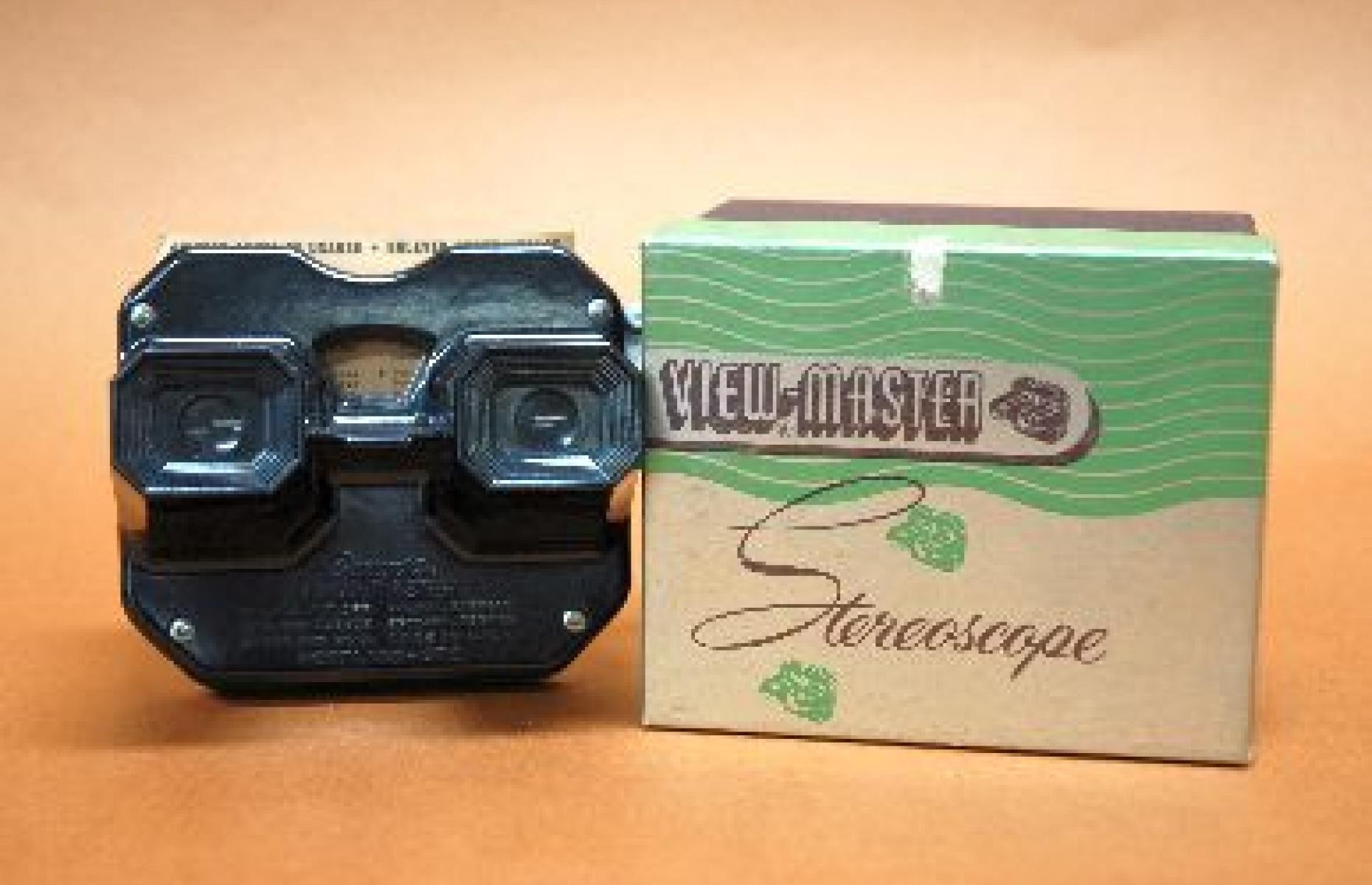 Betrachtungsgerät mit zwei Gucklöchern und integrierten kleinen Linsen, das direkt vor die Augen gehalten wird. Die Bilder sind in Form von Dias auf eine Pappscheibe aufgebracht. Die einzelnen Scheiben auch "Reels" genannt, bestehen aus sieben Stereo-Bildpaaren. Nach dem stereoskopischen Prinzip wird jedem Auge eine jeweils leicht unterschiedliche Version desselben Bildes gezeigt, sodass ein dreidimensionaler Eindruck vermittelt wird. Für den Betrachter scheint sich dadurch ein kleiner Raum zu öffnen, indem eine greifbare Welt existiert. Die Funktionsweise des View-Masters hat sich bis heute nicht grundsätzlich geändert. Der seitlich angebrachte Hebel dient zum Drehen der Scheibe.