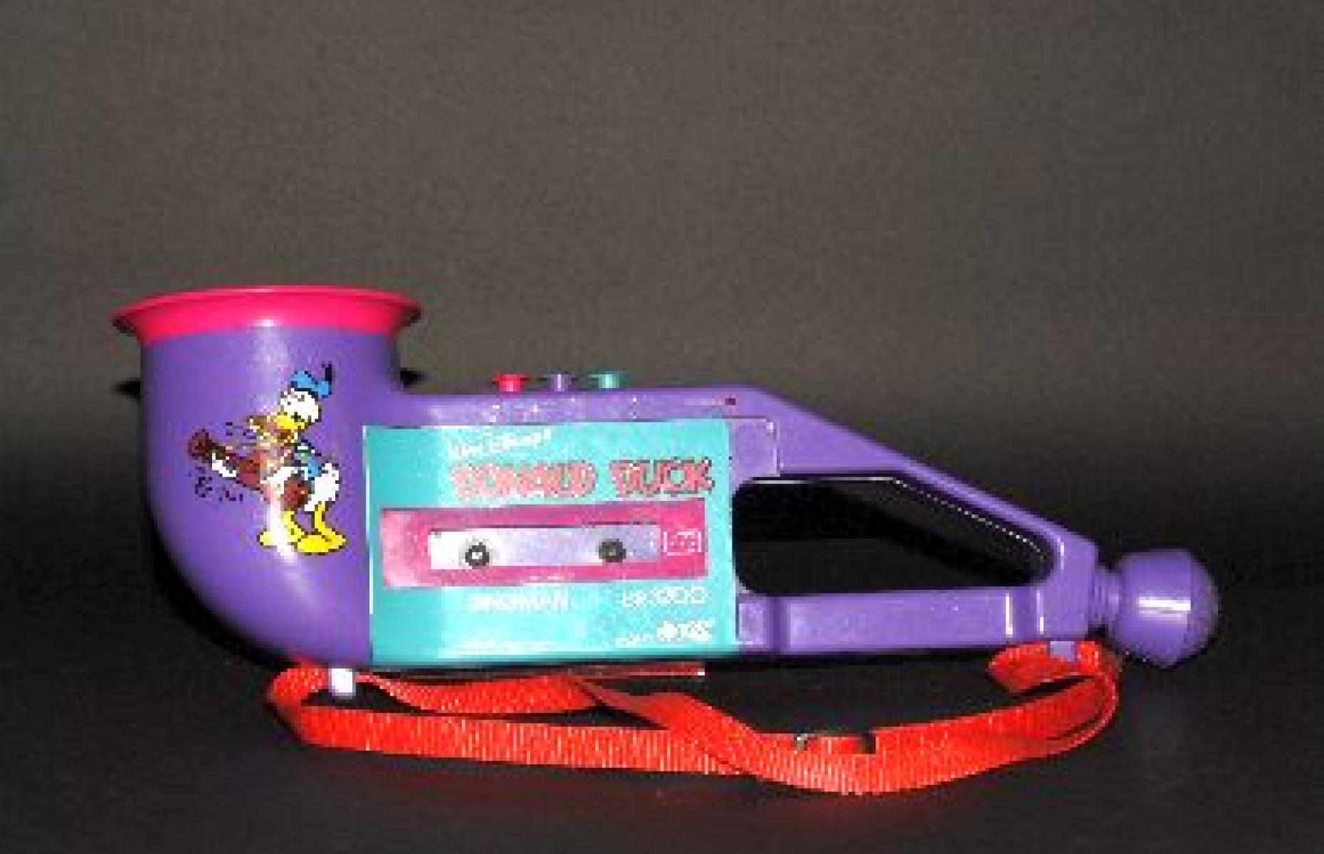 Tragbarer Kassettenrekorder in Saxophonform mit Mikrofon und Trageriemen. Mit aufgeklebten Donald Duck-Motiven. Die Farben des Kassettenrekorders sind lila, türkis und pink.